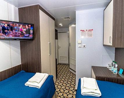В каюте: кровать, шкаф для одежды, трюмо, телевизор, холодильник, сейф, радио, фен, одно обзорное окно, электророзетка на 220V. Две односпальные кровати размером 80х190 см, площадь каюты 13,2 м2.