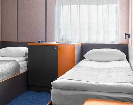 В каютах 401, 402, 404, 410, 411, 431-434 (шлюпочная палуба), 319-322, 339, 340, 345, 346, 365, 366, 369, 370 (средняя палуба) — две односпальные кровати размером 80х180 см, площадь каюты 10 м2