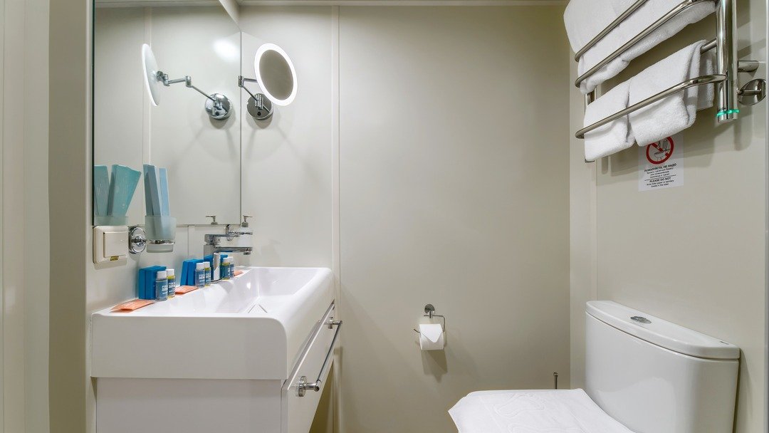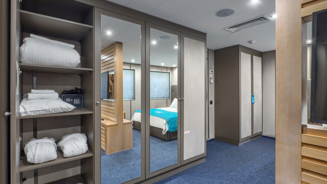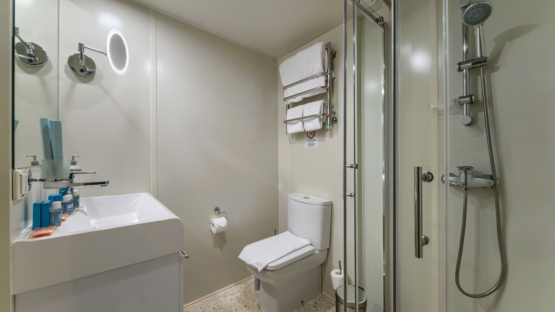 В каюте: двуспальная либо две односпальные кровати, холодильник, телевизор, шкаф для одежды, радио, обзорное окно, душ, санузел, кондиционер, фен, электророзетка на 220V.