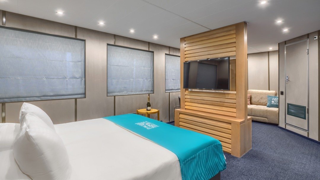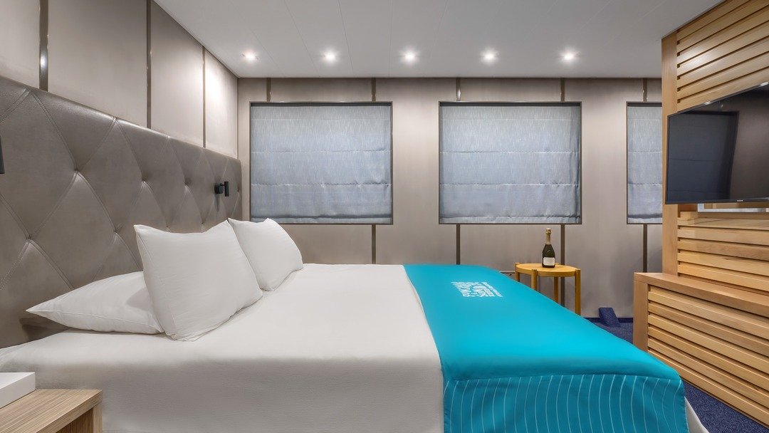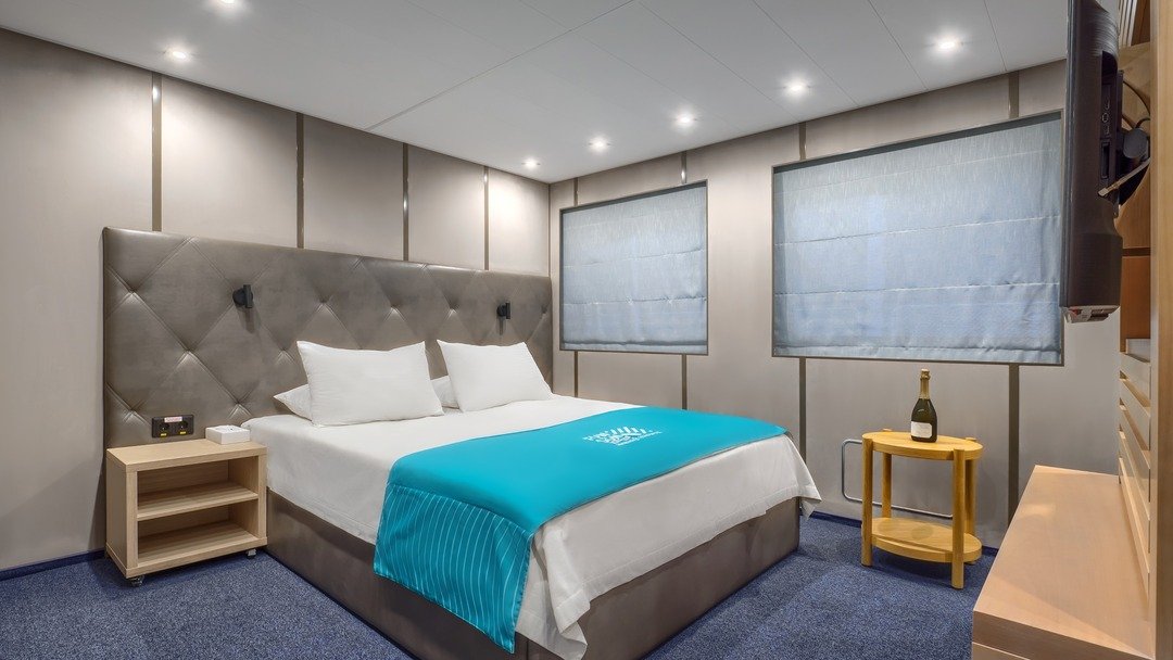 В каюте: двуспальная кровать, диван, кресло, шкаф для одежды, журнальный стол, телевизор, холодильник, фен, радио, четыре обзорных окна, электророзетка на 220V.