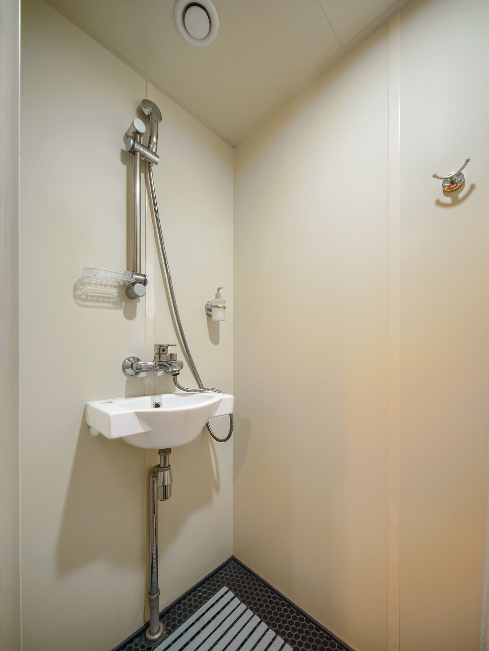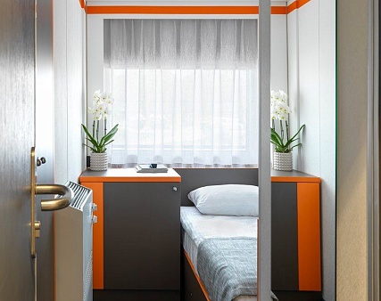 В каюте: одно спальное место, холодильник, минибар, сейф, телевизор, шкаф для одежды, радио, душ, санузел, кондиционер, обзорное окно, фен, электророзетка на 220V.