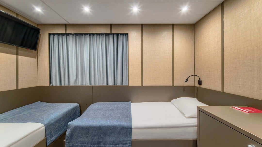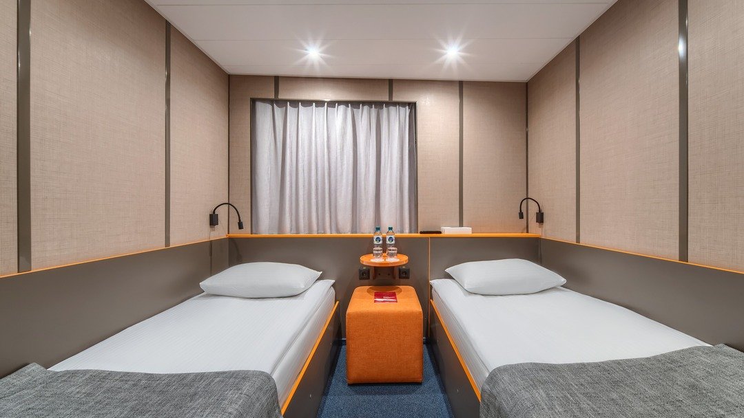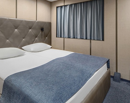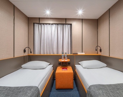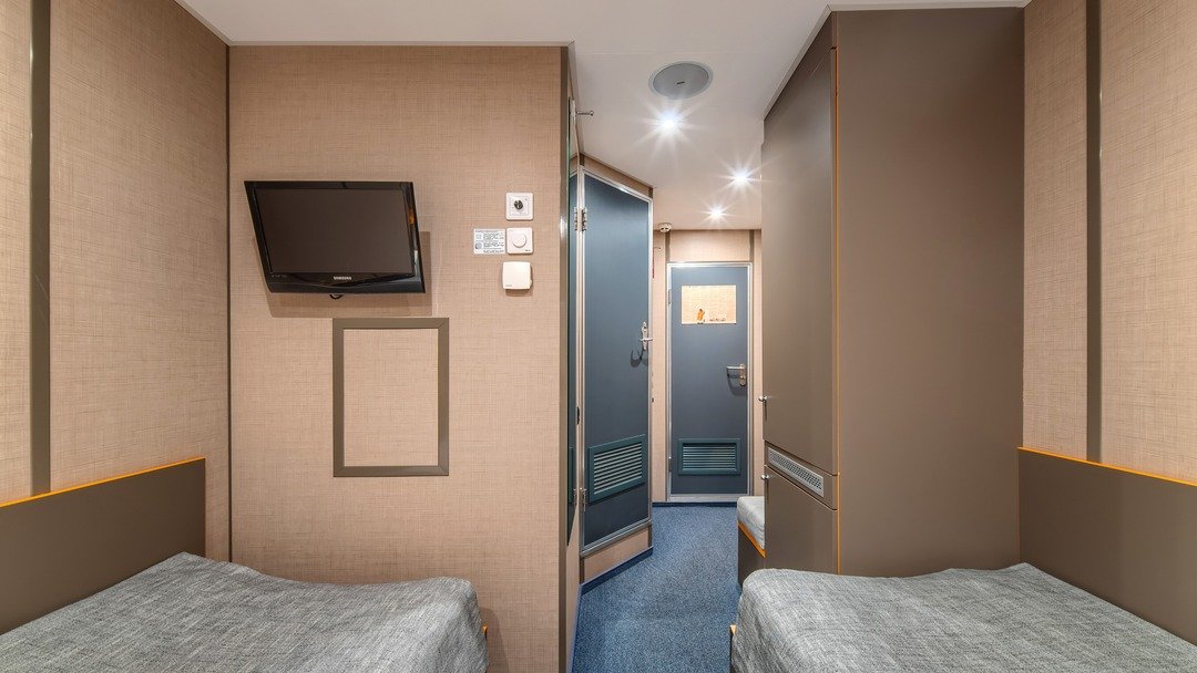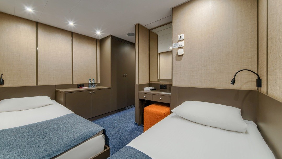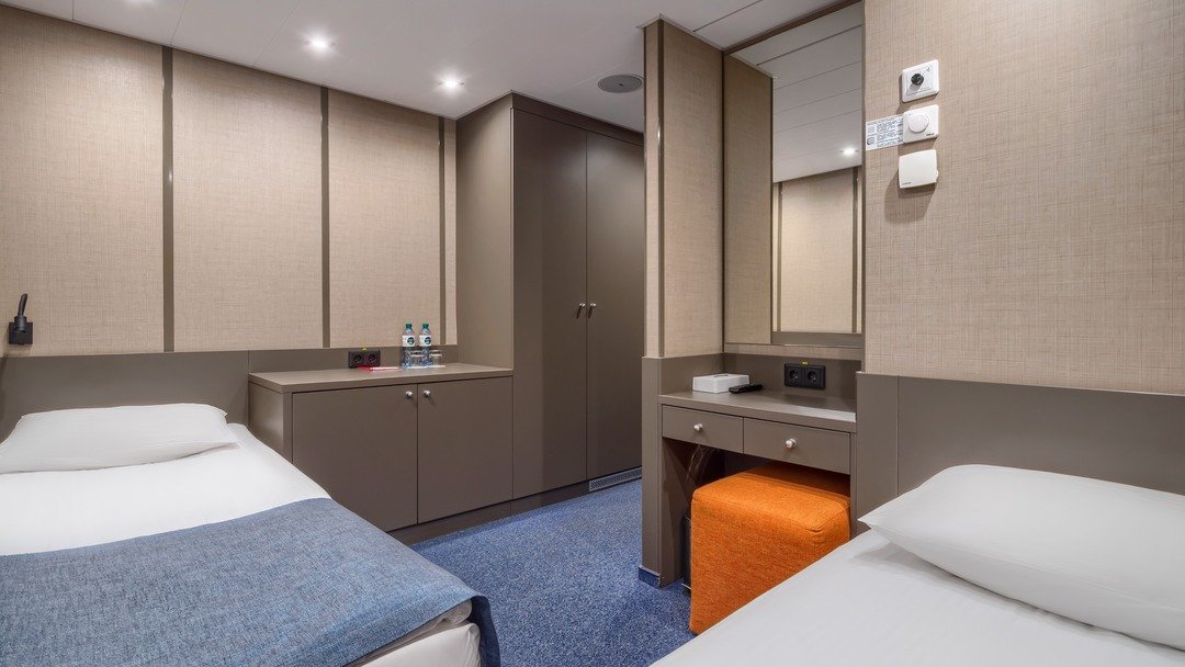 В каюте: две односпальные кровати (не сдвигаются), кресло, шкаф для одежды, пуфик, сейф, телевизор, холодильник, радио, обзорное окно, душ (душевая штора из водоотталкивающего материала или душевая стеклянная ширма), санузел, кондиционер, фен, электророзетка на 220V.