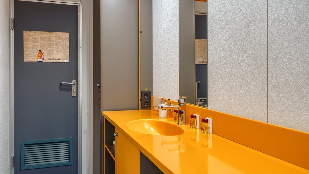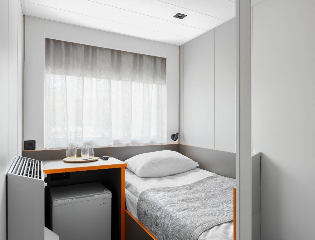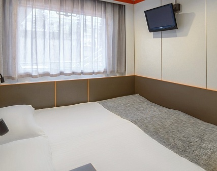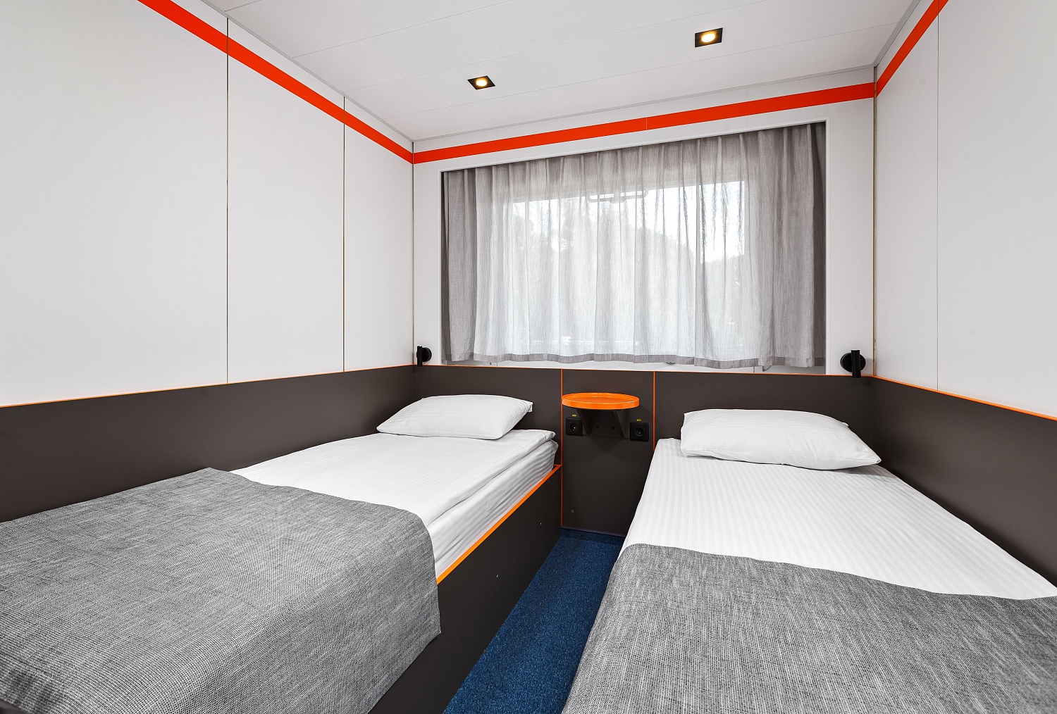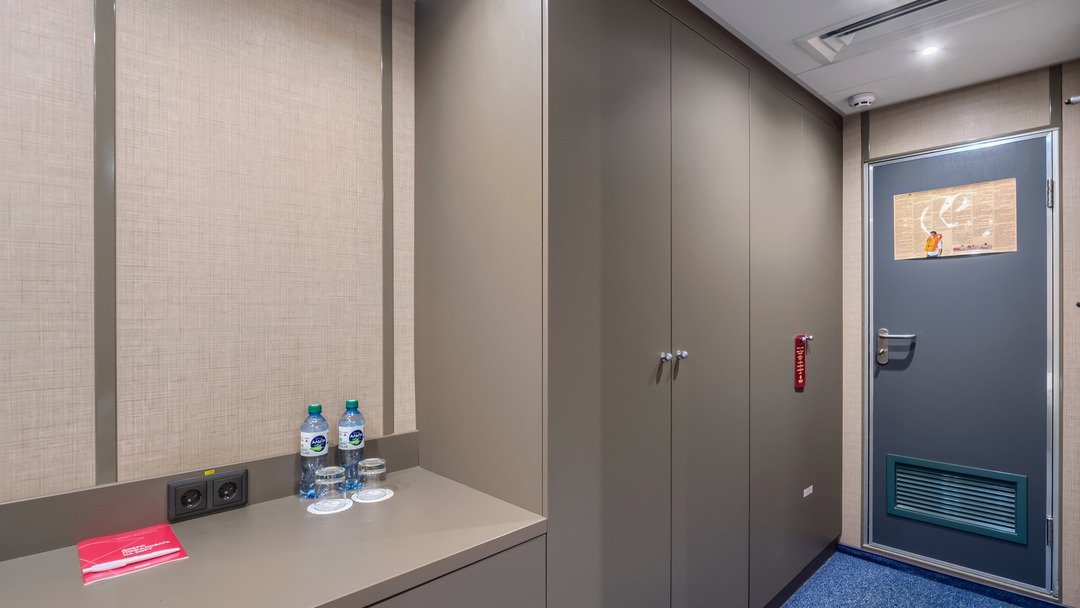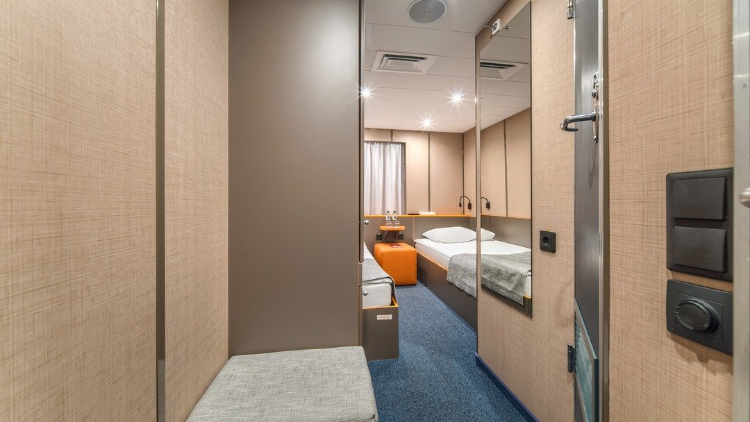 В каюте: две односпальные кровати (не сдвигаются), кресло, шкаф для одежды, пуфик, сейф, телевизор, холодильник, радио, обзорное окно, душ (душевая штора из водоотталкивающего материала или душевая стеклянная ширма), санузел, кондиционер, фен, электророзетка на 220V.