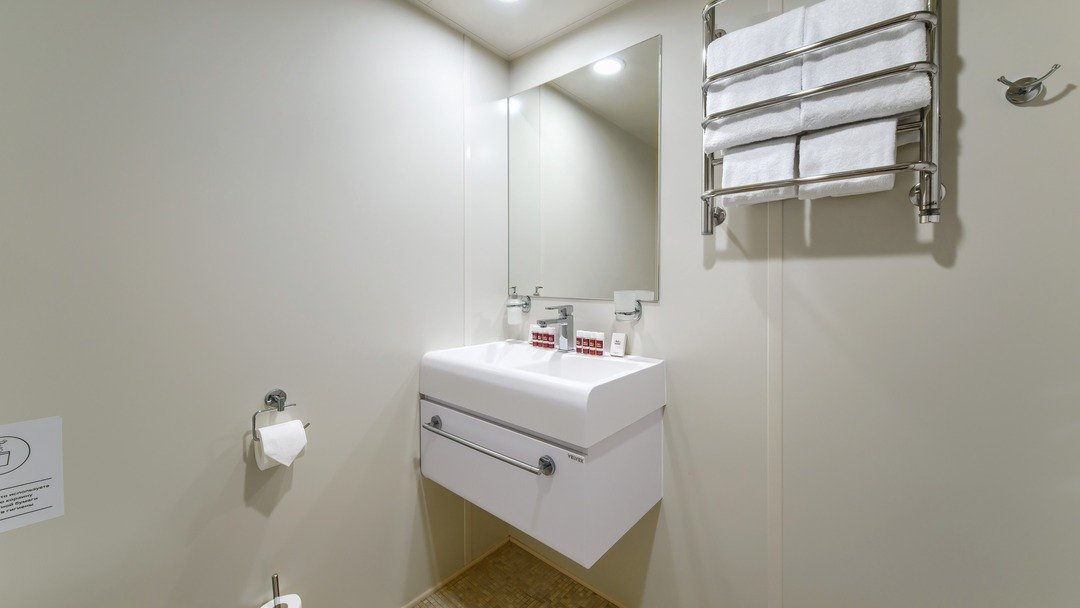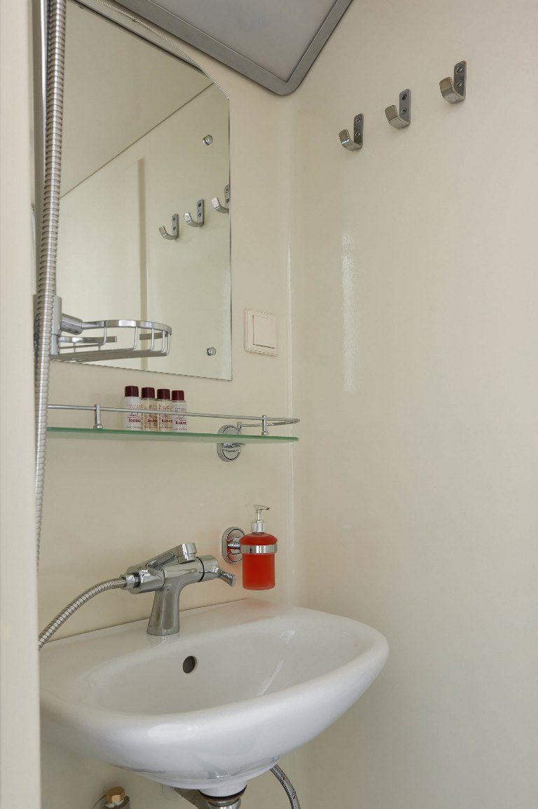 В каюте: две односпальные кровати, холодильник, минибар, сейф, телевизор, шкаф для одежды, радио, обзорное окно, душ, санузел, кондиционер, фен, сейф, электророзетка на 220V.