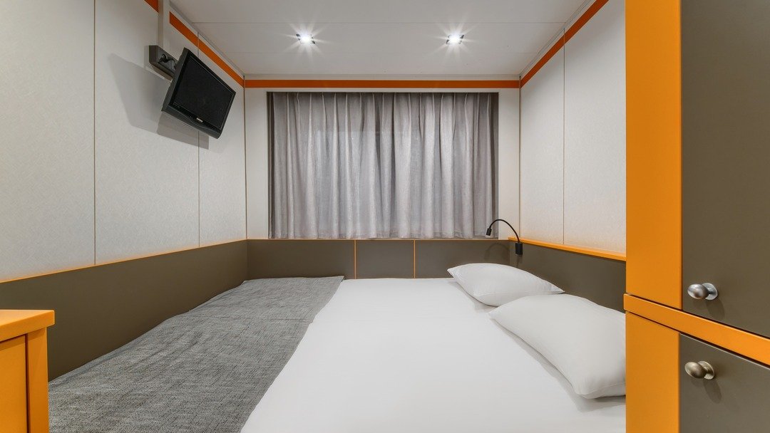 В каюте: двуспальная кровать (не раздвигается), кресло, шкаф для одежды, пуфик, сейф, телевизор, холодильник, минибар, радио, обзорное окно, душ (душевая штора из водоотталкивающего материала или душевая стеклянная ширма), санузел, кондиционер, фен, электророзетка на 220V.