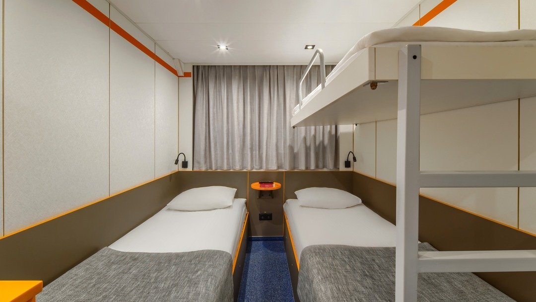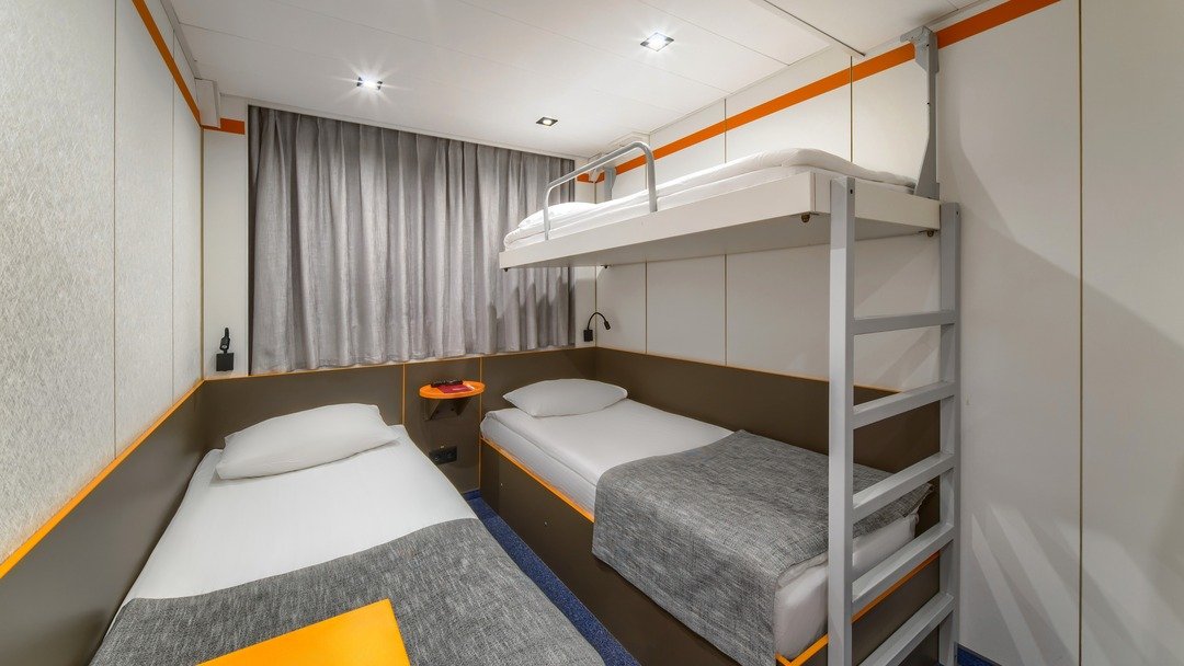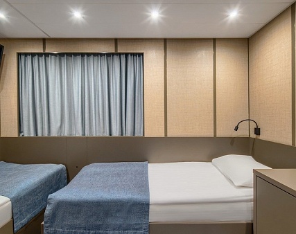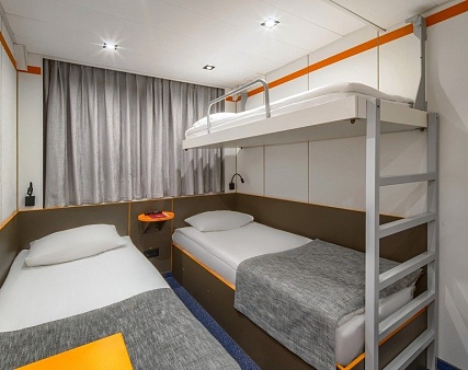 В каюте три спальных места (не сдвигаются, верхнее место не складывается), шкаф для одежды, холодильник, минибар, сейф, телевизор, радио, душ, санузел, кондиционер, фен, сейф, два иллюминатора, электророзетка на 220V. Возможна продажа каюты в двухместном одноярусном размещении (по стоимости 2-местной каюты).