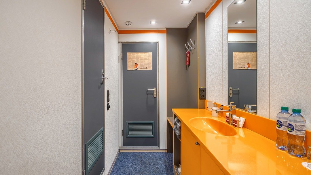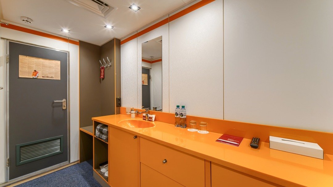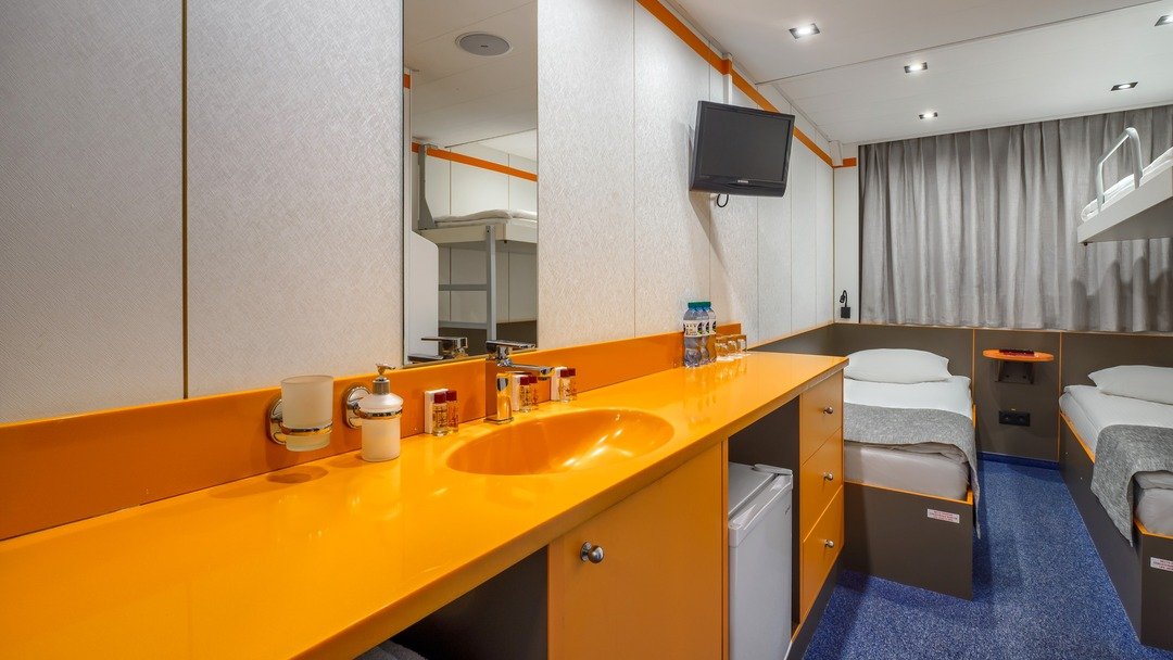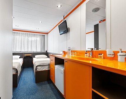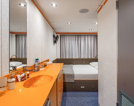 В каюте: две односпальные кровати, холодильник, минибар, сейф, телевизор, шкаф для одежды, радио, обзорное окно, душ, санузел, кондиционер, фен, электророзетка на 220V.
