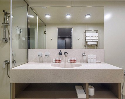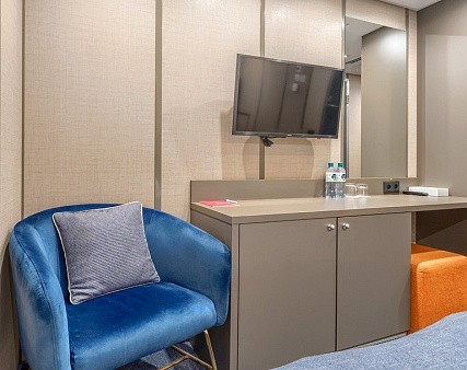 В каюте: две односпальные кровати (не сдвигаются), кресло, шкаф для одежды, пуфик, сейф, телевизор, холодильник, радио, обзорное окно, душ (душевая штора из водоотталкивающего материала или душевая стеклянная ширма), санузел, кондиционер, фен, электророзетка на 220V.