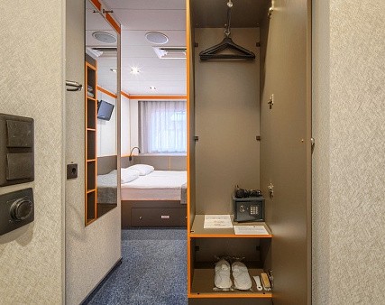 В каюте: две односпальные кровати, холодильник, минибар, сейф, телевизор, шкаф для одежды, радио, обзорное окно, душ, санузел, кондиционер, фен, электророзетка на 220V.