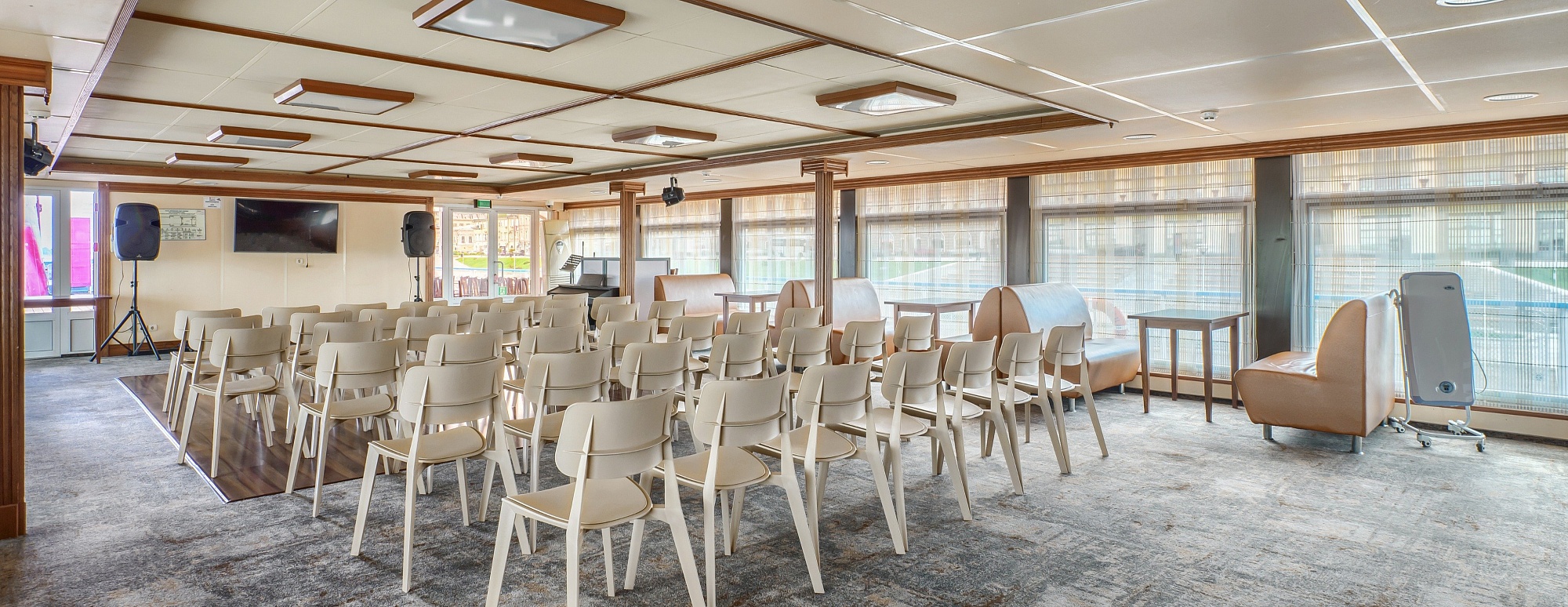 В каюте: два спальных места, шкаф для одежды, зеркало, радио, душ, санузел, кондиционер, обзорное окно, электророзетка на 220V.
