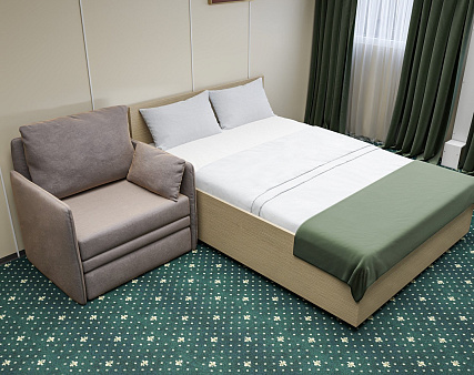 В первой комнате: двуспальная кровать, кресло (номера кают: 124, 125), кресло-кровать (номера кают: 7, 8), ТВ-стенка, телевизор, фен, кондиционер, холодильник, радио, два обзорных окна, электророзетка на 220V.