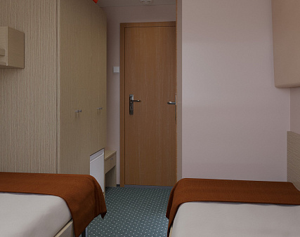 Во второй комнате: одно (номера кают: 7, 8) или два — одно над другим (номера кают: 124, 125) спальных места, шкаф для одежды, душ, санузел, обзорное окно.