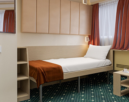 В каюте: три спальных места (два внизу, третье вторым ярусом), шкаф для одежды, зеркало, радио, фен, душ, санузел, холодильник, кондиционер, обзорное окно, электророзетка на 220V.