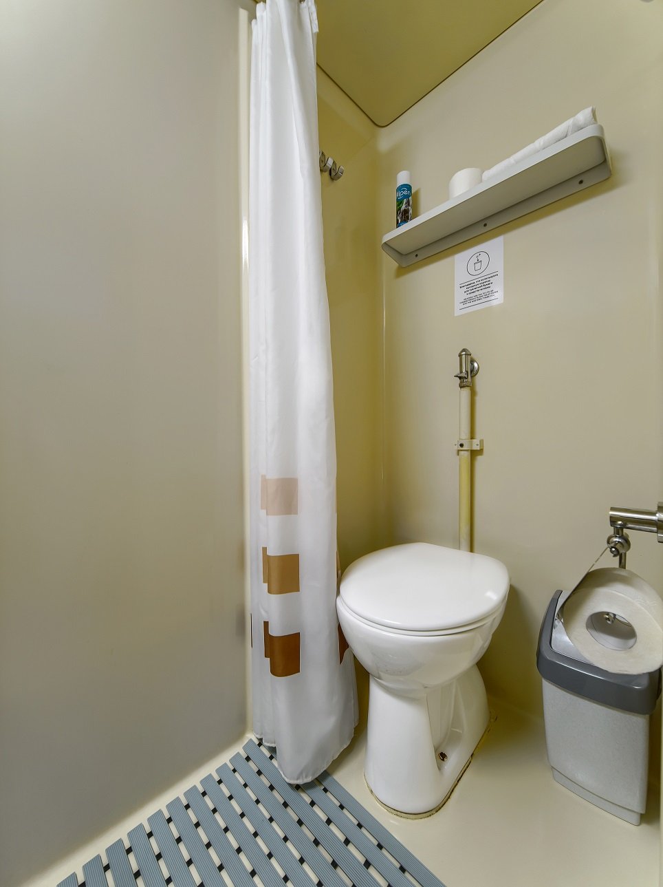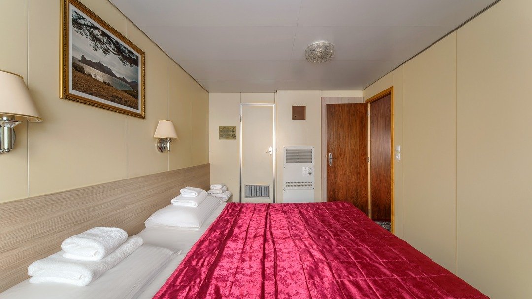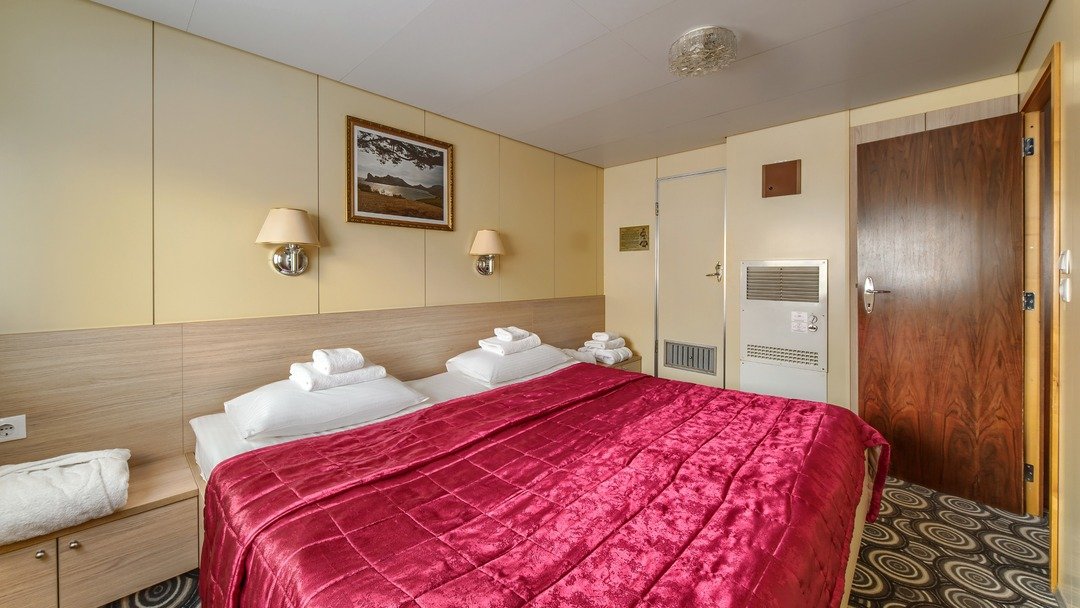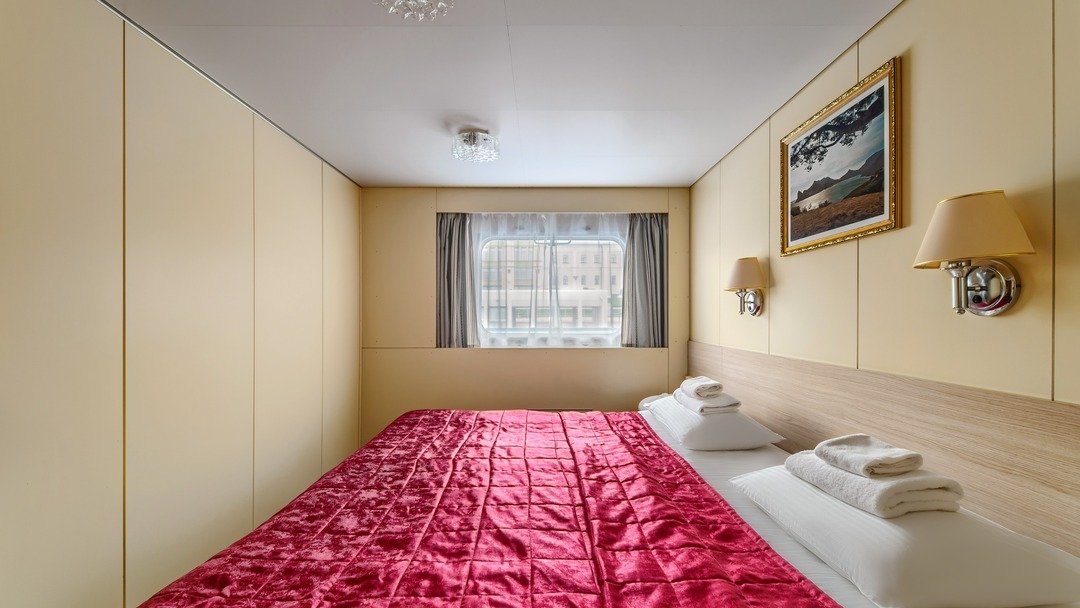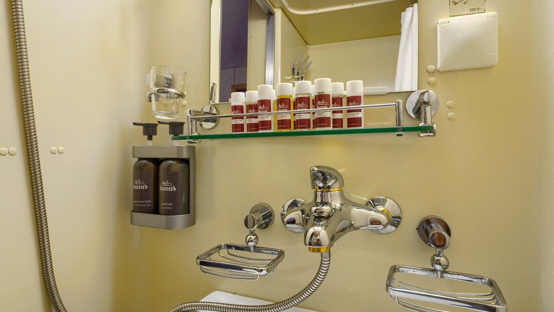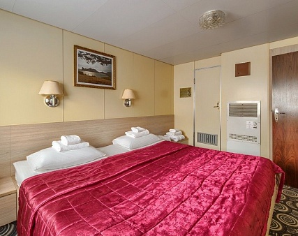 В каюте: два спальных места, шкаф для одежды, холодильник, радио, душ, санузел, кондиционер, обзорное окно, электророзетка на 220V.