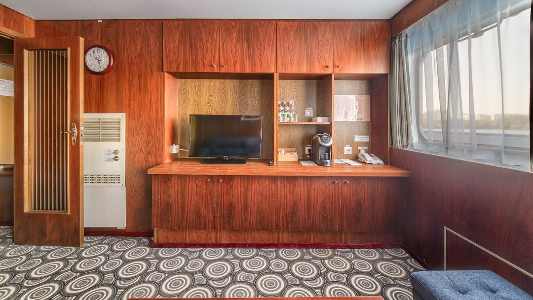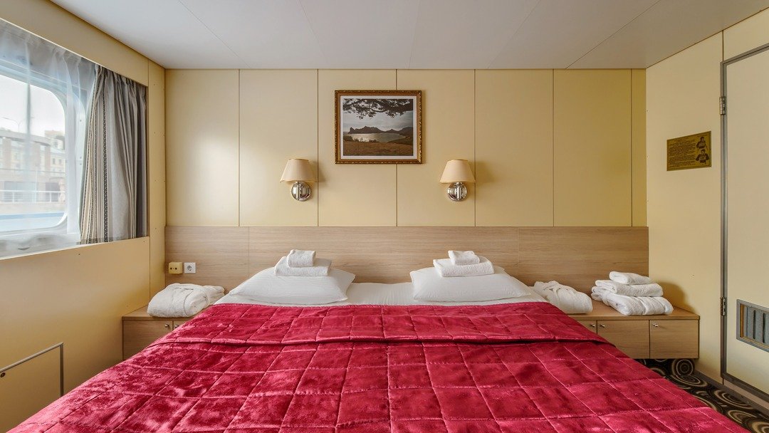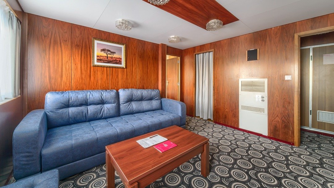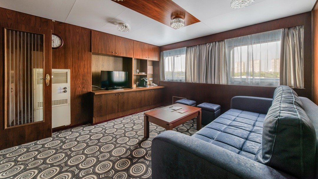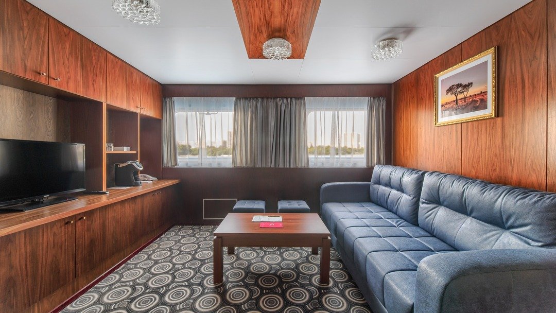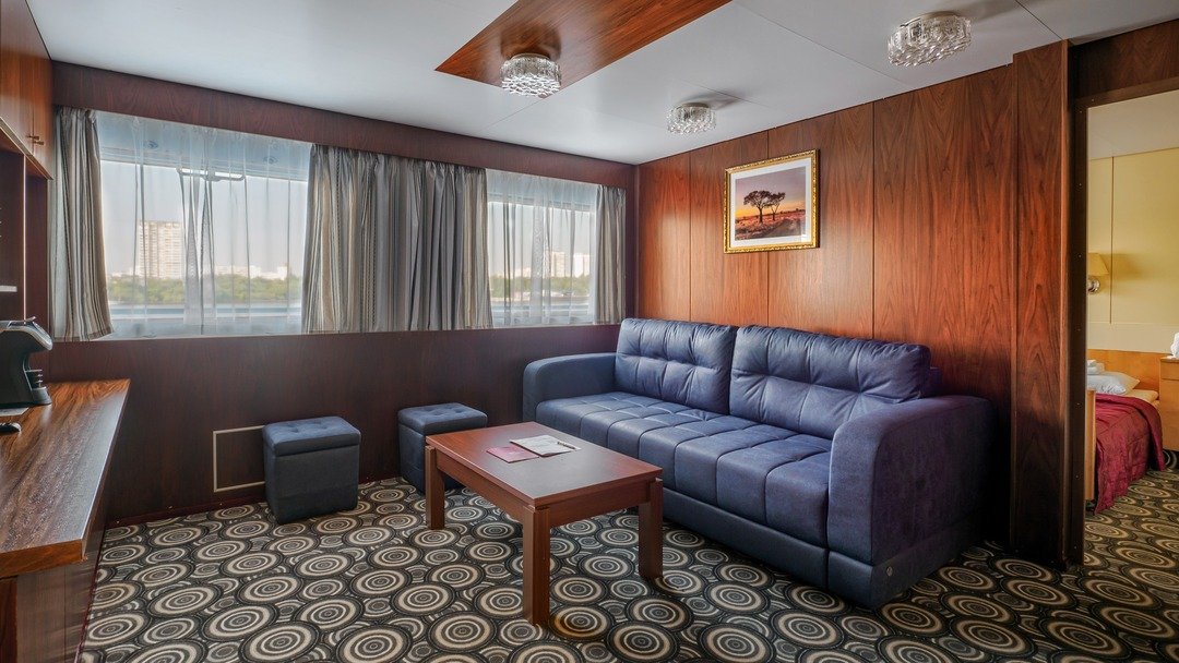 Двухкомнатная каюта с удобствами (душ, санузел, кондиционер). Каюта рассчитана на размещение двух человек ( возможно добавить два дополнительных платных места). В гостиной: мягкая мебель (диван), шкафы для одежды, телевизор, холодильник, радио, мини-кухня, два обзорных окна, электророзетка на 220V. В спальне: двуспальная кровать, обзорное окно.