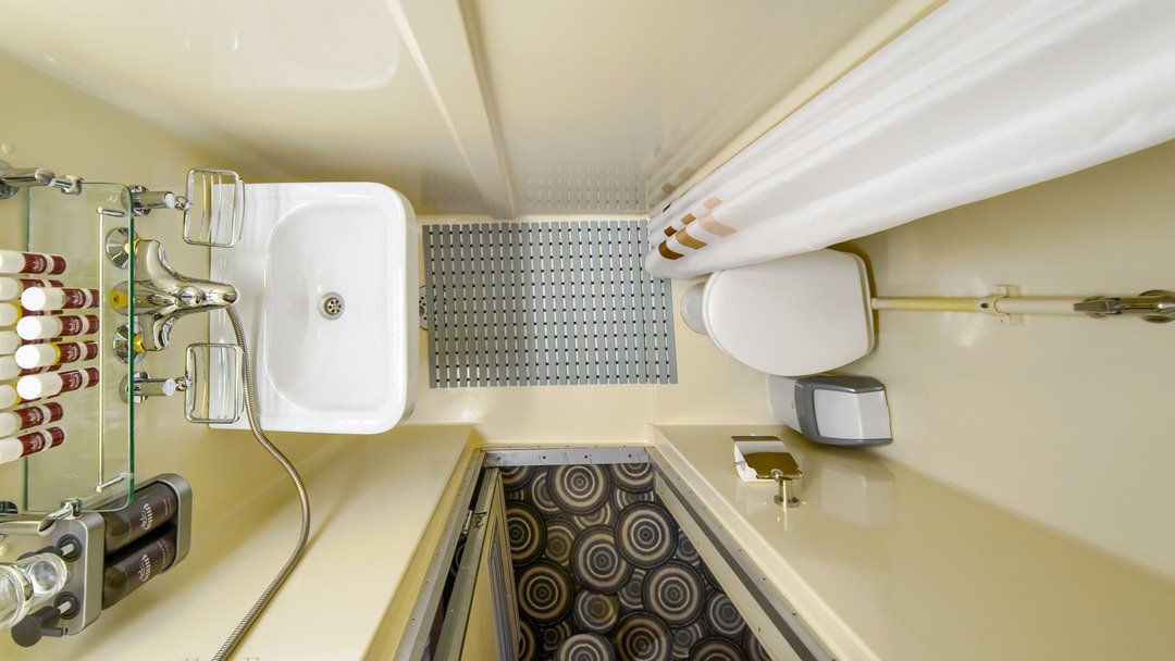 В каюте: четыре спальных места (два внизу, два вторым ярусом), шкаф для одежды, холодильник, радио, душ, санузел, кондиционер, два иллюминатора, электророзетка на 220V. Площадь каюты - 12,81 кв.м.