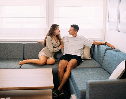В каюте: частная палуба на 4 каюты, одна двуспальная кровать, диван, холодильник, кондиционер, гардероб, телевизор, телефон, фен, сейф, халаты, увлажнитель воздуха, кофемашина, чайник, персональный дворецкий. Ванная комната с ванной и туалетом.