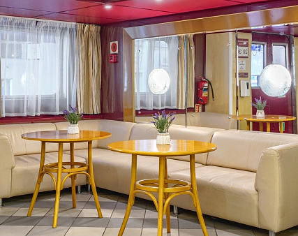 В каюте: три спальных места (два внизу, одно — вторым ярусом), шкаф для одежды, радио, зеркало, душ, санузел, кондиционер, обзорное окно, электророзетка на 220V.