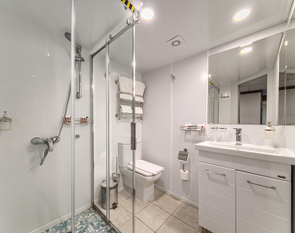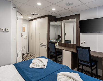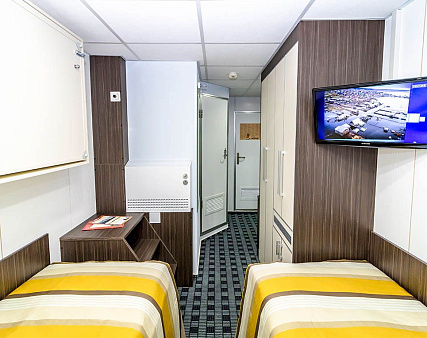 В каюте: три спальных места (два внизу, одно — вторым ярусом), шкаф для одежды, трюмо, радио, телевизор, холодильник, фен, сейф, обзорное окно, электророзетка на 220V.