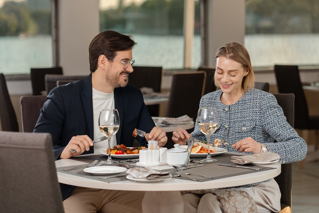 - Полупансион (завтрак + ужин): завтрак — шведский стол или заказная система с элементами шведского стола, фиксированная рассадка. Включённые напитки (без ограничения): вода*, сок, чай, кофе; ужин — заказная система питания (выбор блюд со 2-го дня круиза), фиксированная рассадка. Включённые напитки (без ограничения): вода*, чай, кофе, кисломолочный продукт (1 стакан, 200 мл); порционно на выбор - вино красное / белое / игристое (1 бокал, 125 мл) / водка (1 рюмка, 50 мл) / пиво (1 бокал, 300 мл) / домашний морс (1 бокал, 200 мл).