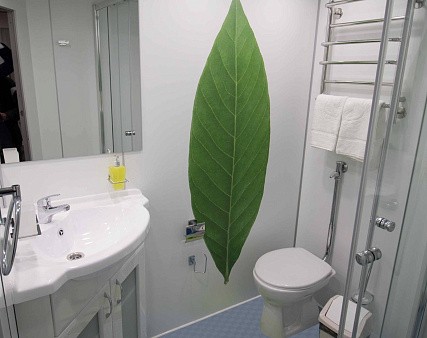 В каюте: три спальных места (два внизу, одно — вторым ярусом), шкаф для одежды, трюмо, кондиционер, радио, телевизор, холодильник, фен, сейф, обзорное окно, электророзетка на 220V.