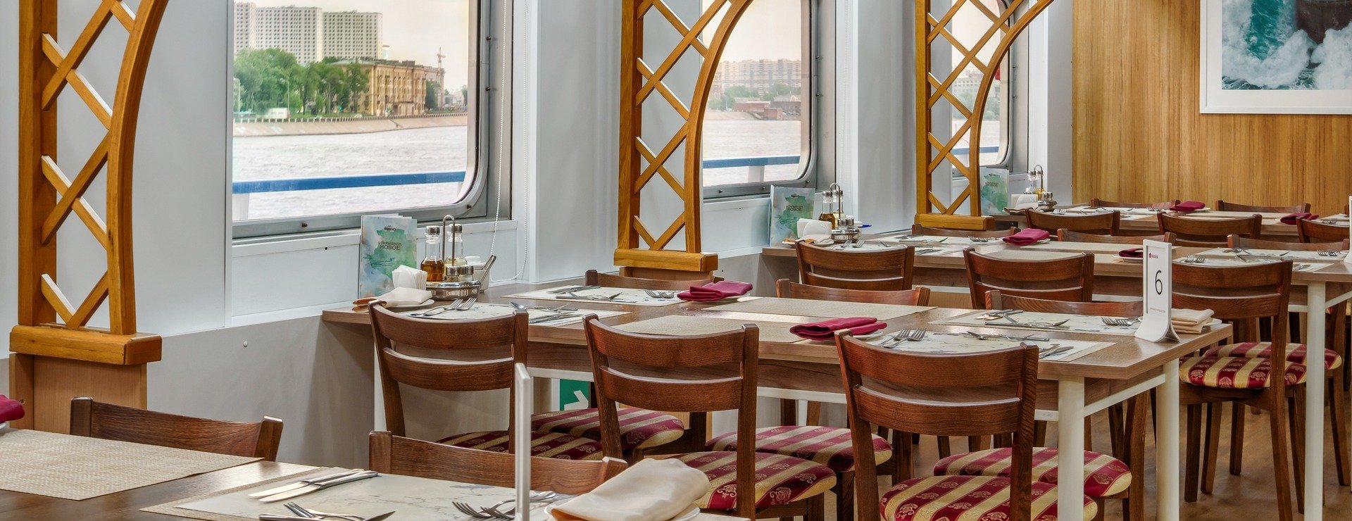 - Ужин — заказная система питания (выбор блюд со 2-го дня круиза). Включённые напитки (без ограничения): вода, чай, кофе, кисломолочный напиток (1 стакан 200 мл на ужин по запросу гостя). На выбор: вино красное / белое / игристое (1 бокал, 125 мл) / водка (1 рюмка, 50 мл) / пиво (1 бокал, 300 мл), домашний морс (1 бокал, 200 мл);