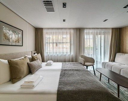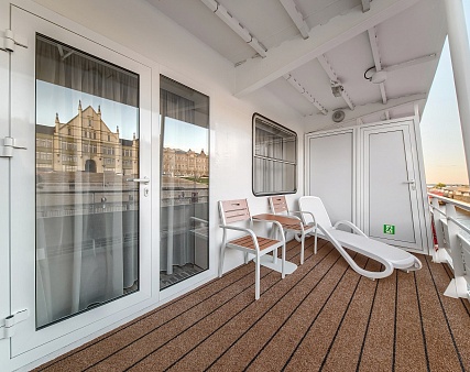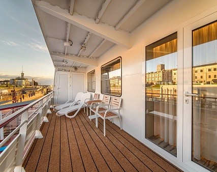 Комфортабельная комната с современным интерьером. Удобства: диван (раскладывается), телевизор, двуспальная кровать (кровати раздвигаются), прикроватные тумбы, письменный стол, холодильник, книжный стеллаж, журнальный столик, пуф, шкаф для одежды, 4 розетки на 220V, две розетки USB, фен. Балкон: два кресла, кофейный столик. Размер кровати — 175х210 см. В каюте возможно 3-местное размещение.