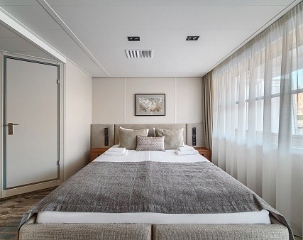 Комфортабельная комната с современным интерьером. Удобства: диван (раскладывается), телевизор, двуспальная кровать (кровати раздвигаются), прикроватные тумбы, письменный стол, холодильник, книжный стеллаж, журнальный столик, пуф, шкаф для одежды, мини-бар, 4 розетки на 220V, две розетки USB, фен. Размер кровати — 175х210 см. В каюте возможно 3-местное размещение.