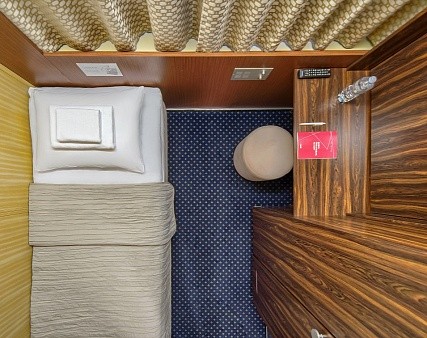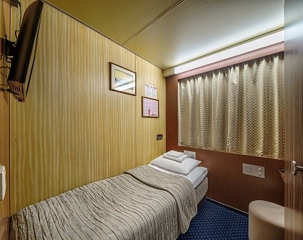 В каюте: одно спальное место, шкаф для одежды, радио, кондиционер, телевизор, холодильник, фен, сейф, душ, санузел, обзорное окно, электророзетка на 220V.