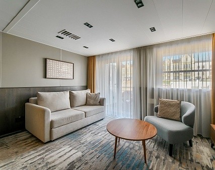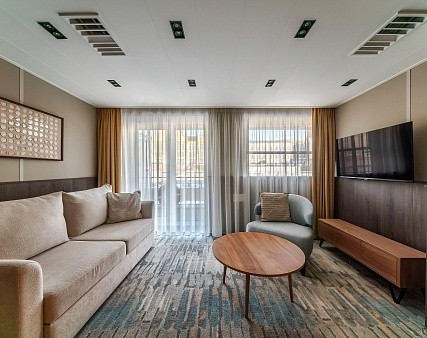 Комфортабельная гостиная с современным интерьером. Удобства: диван (раскладывается), кресло, журнальный столик, холодильник, телевизор, тумба, шкаф для одежды, прикроватные тумбы, 4 розетки на 220V, две розетки USB, фен. Балкон: два кресла, кофейный столик, два шезлонга. В спальне: двуспальная кровать (кровати раздвигаются), письменный стол, книжный стеллаж. В каюте возможно 4-местное размещение. Размер кровати —175х210 см. Размер дивана — 150х185 см.