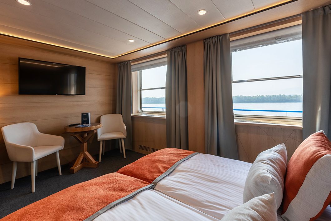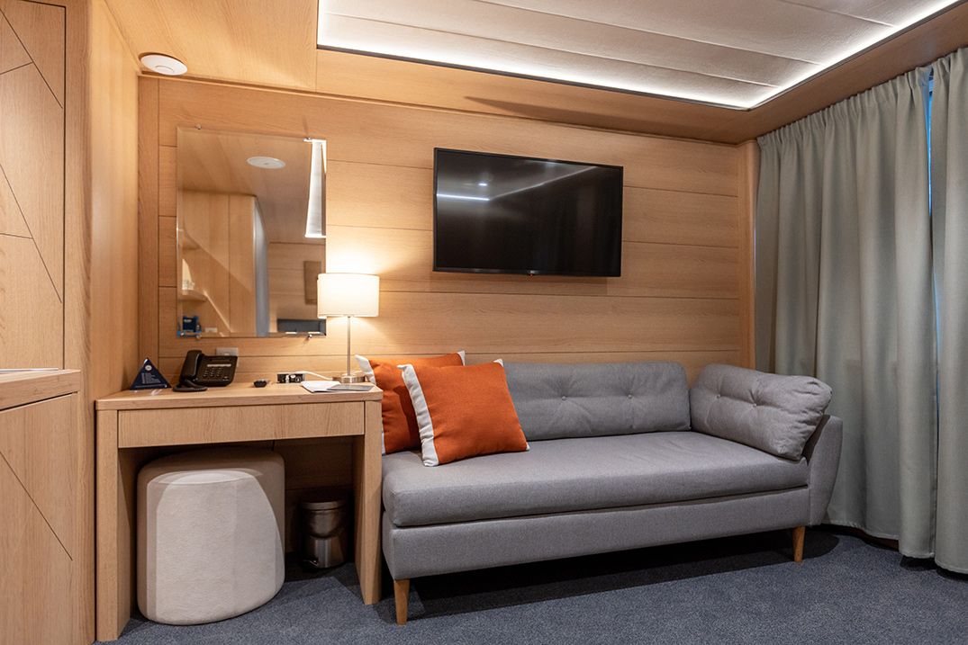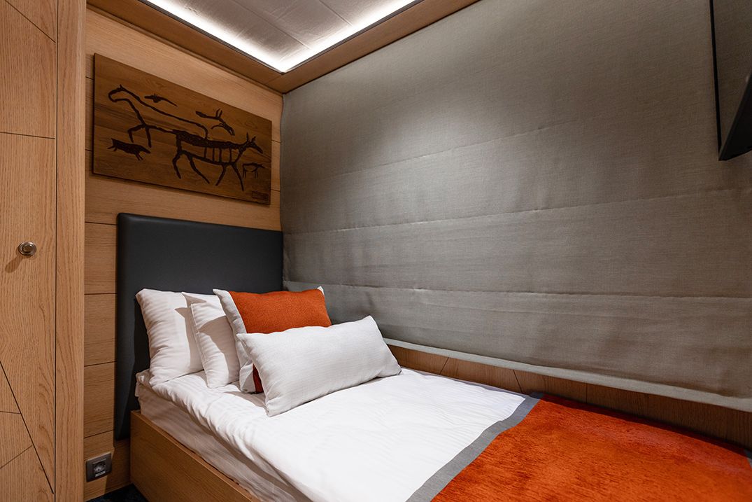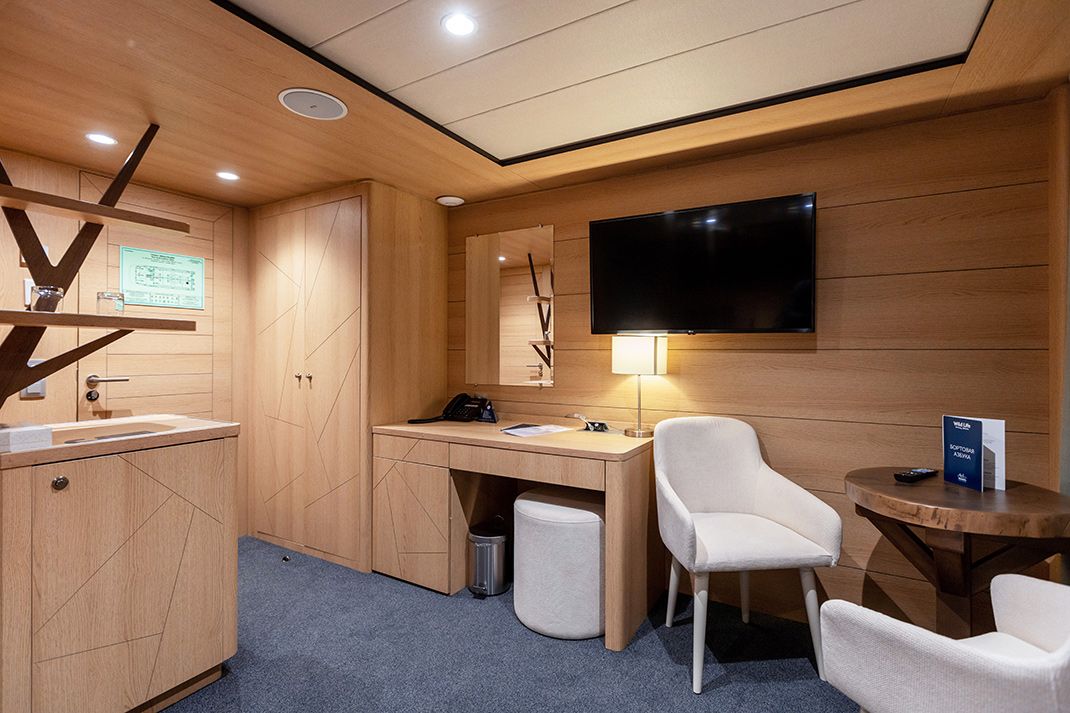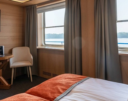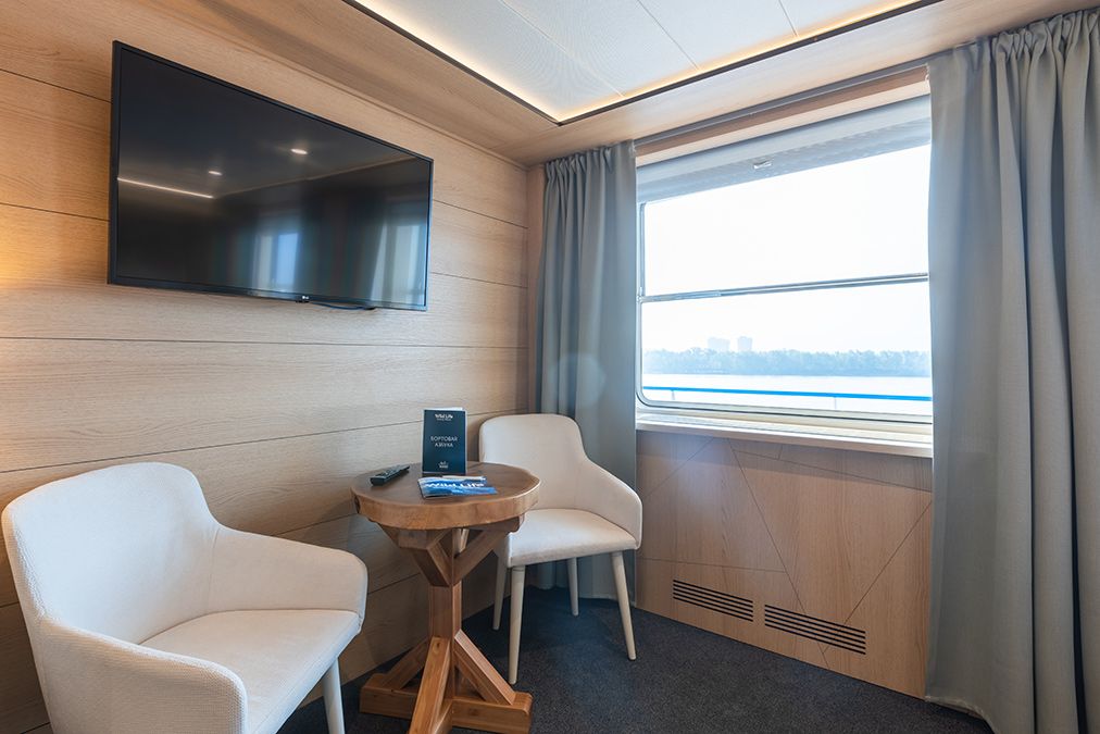 В каюте: две односпальные кровати (можно сдвинуть), диван, шкаф для одежды, холодильник, телевизор, фен, радио, сейф, два окна, электророзетка на 220V.