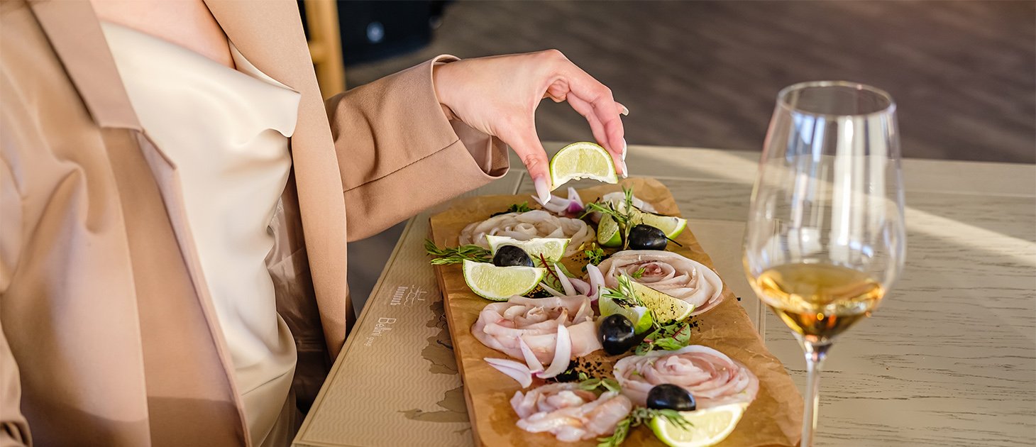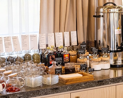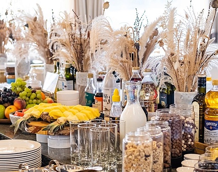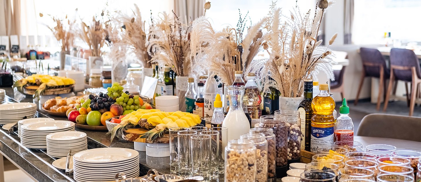- Завтрак, обед – заказная система, фиксированная рассадка с элементами шведского стола (фрукты, десерты, соусы) и включенными напитками (вода, чай, кофе, домашний морс, сок) без ограничения;