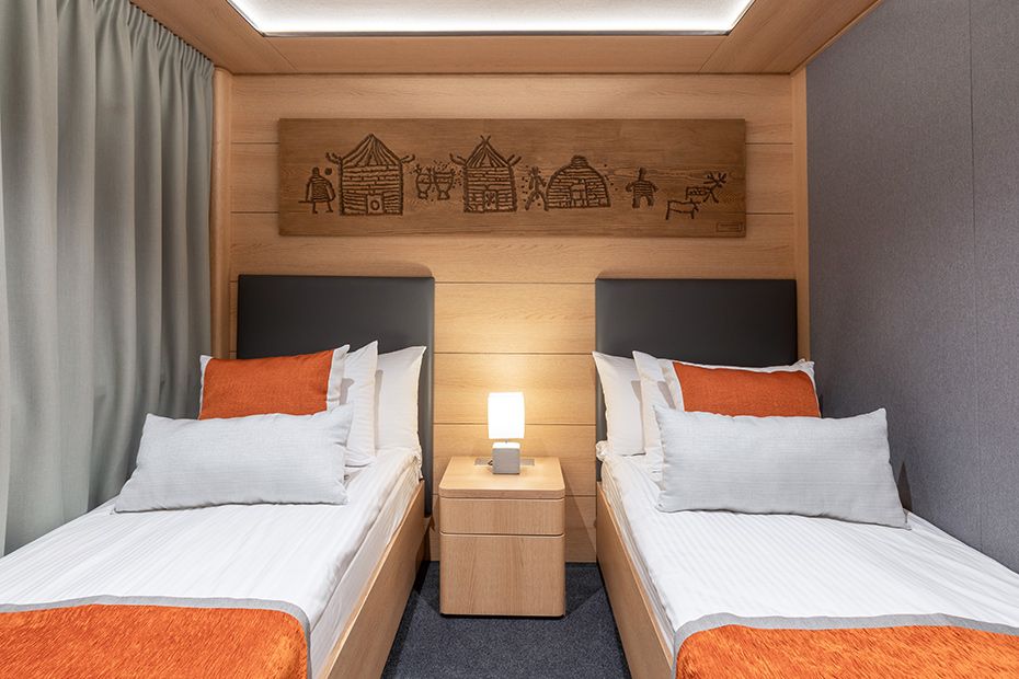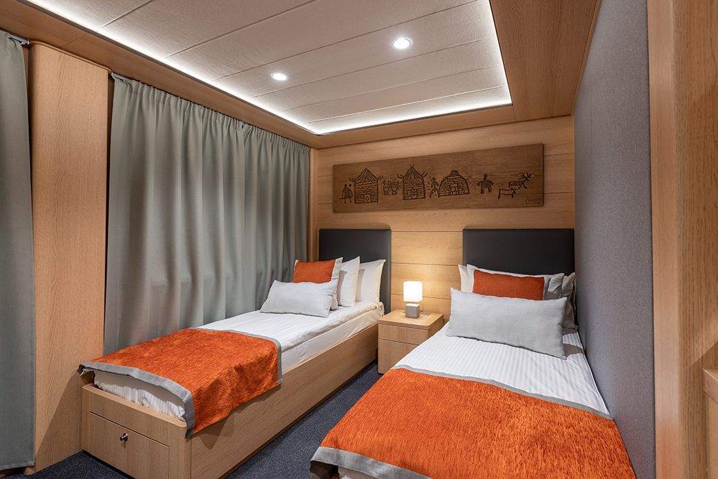в каютах №101-118 — две односпальные кровати (можно сдвинуть), площадь каюты 17,7 м2;