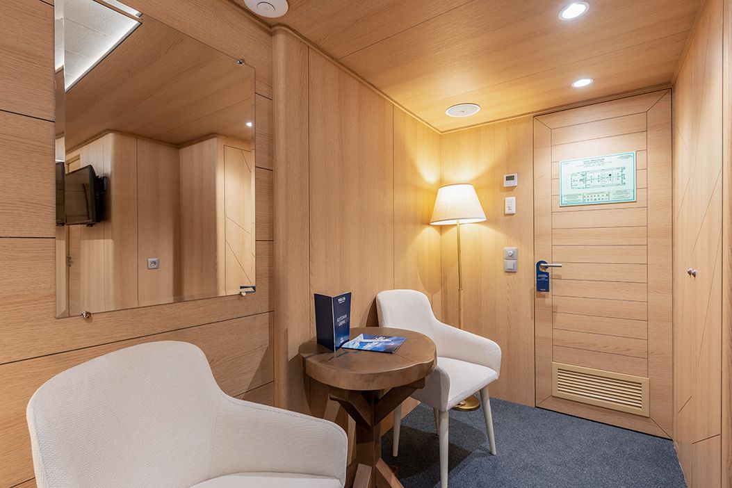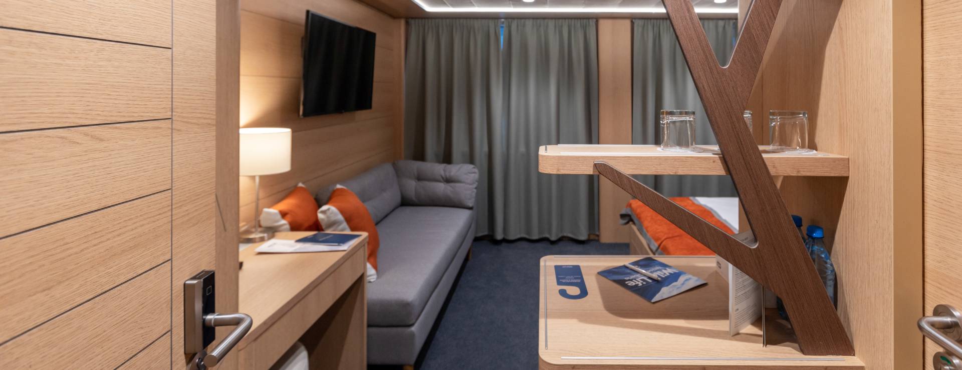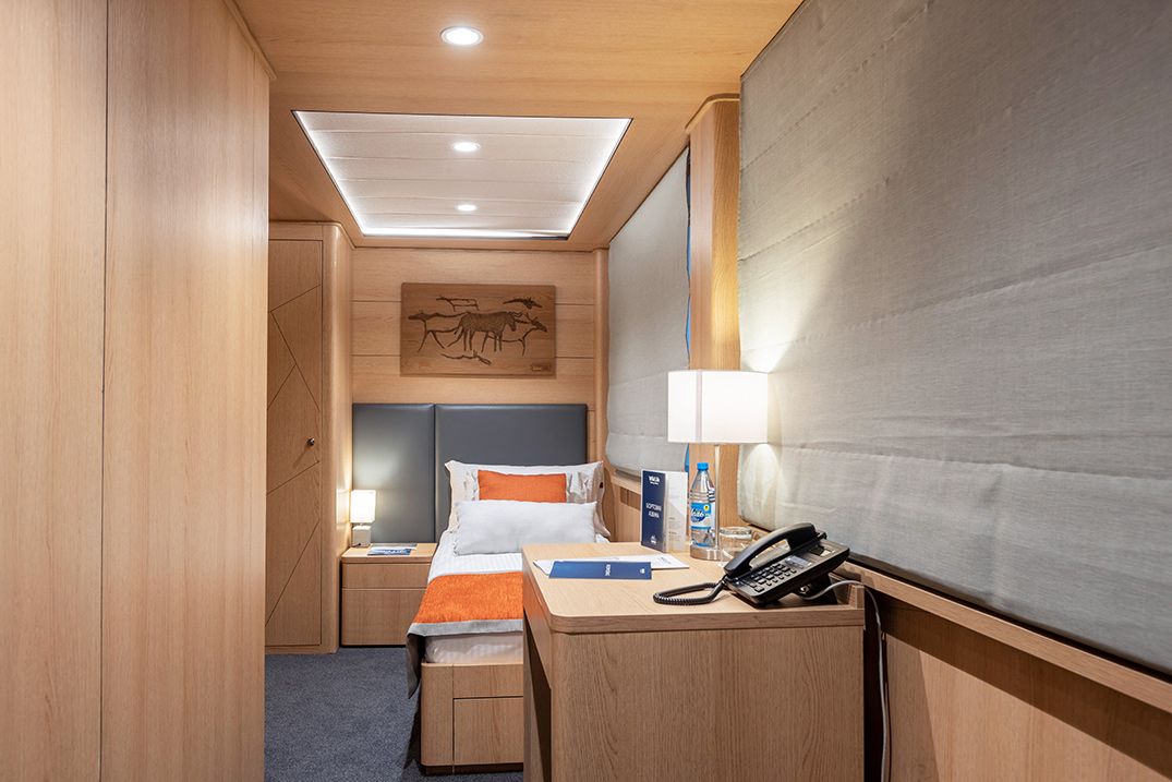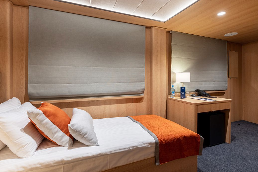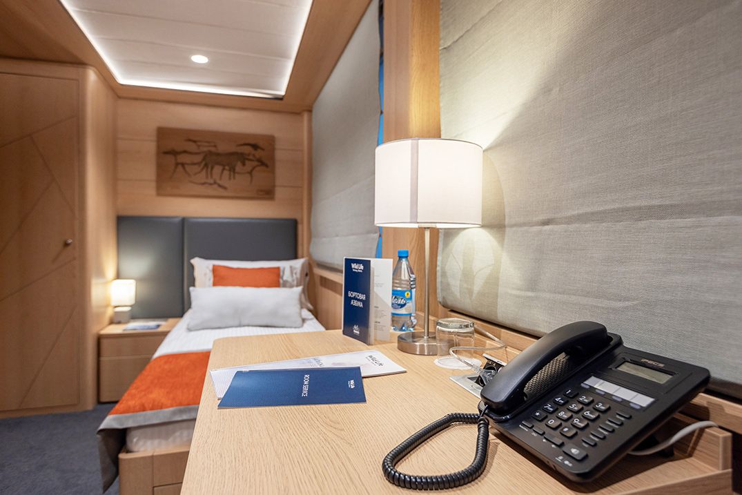 В каюте: односпальная кровать, шкаф для одежды, радио, кондиционер, телевизор, холодильник, фен, сейф, душ, санузел, обзорное окно, электророзетка на 220V.