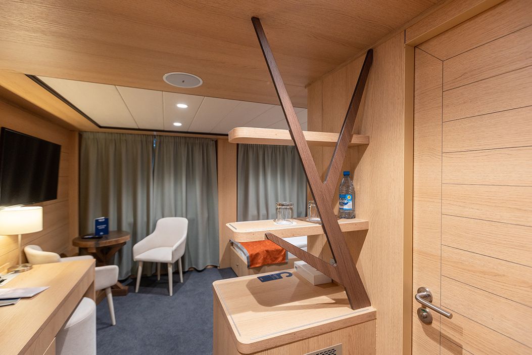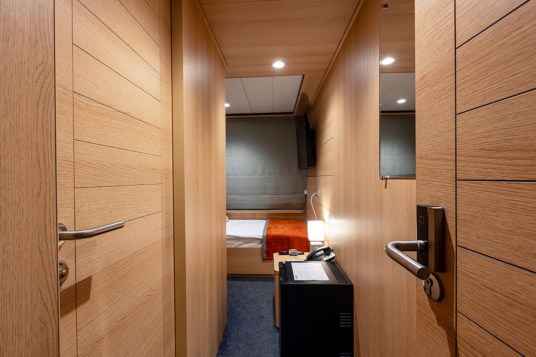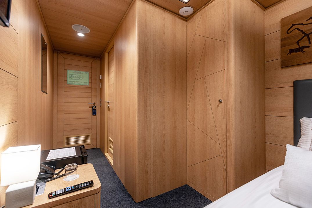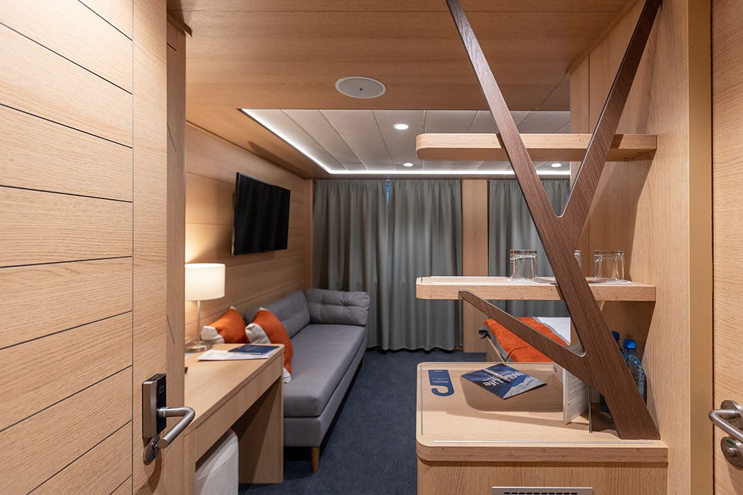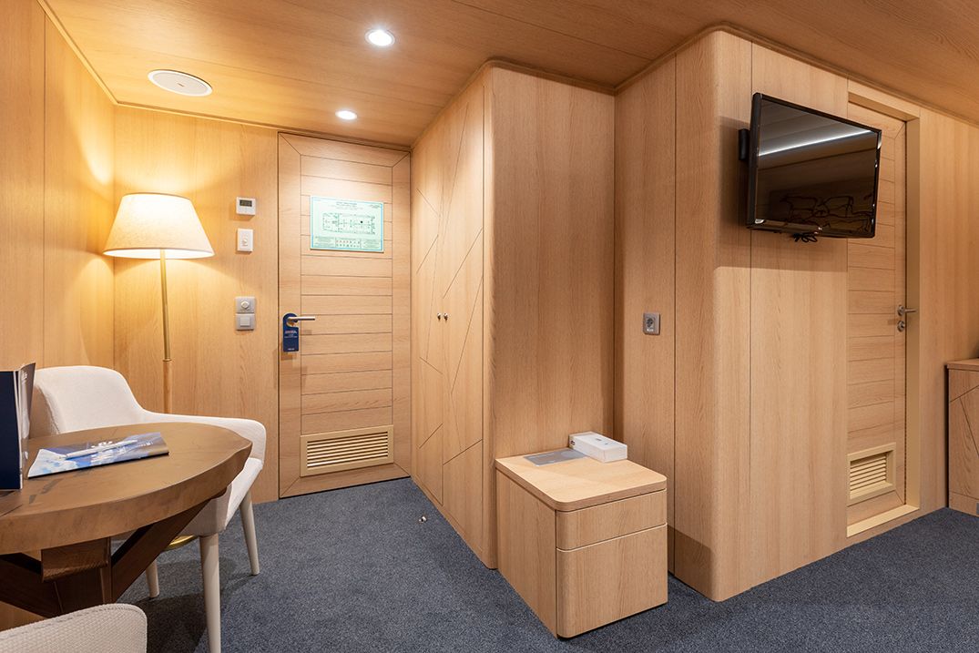 В каюте: односпальная кровать, шкаф для одежды, радио, кондиционер, телевизор, холодильник, фен, сейф, душ, санузел, обзорное окно, электророзетка на 220V.