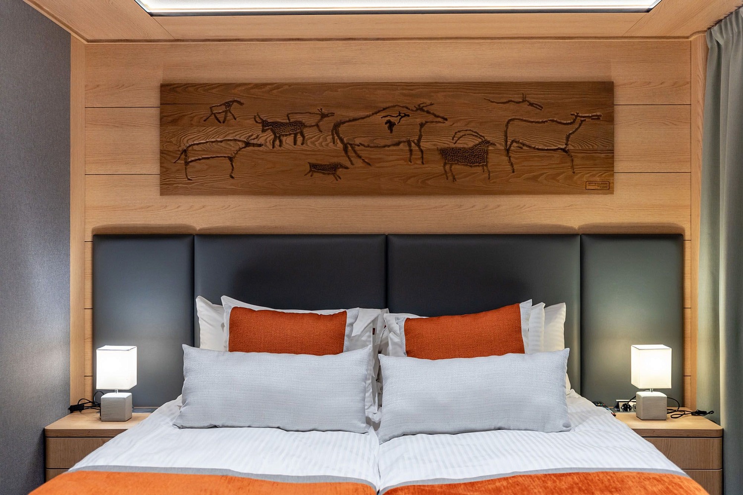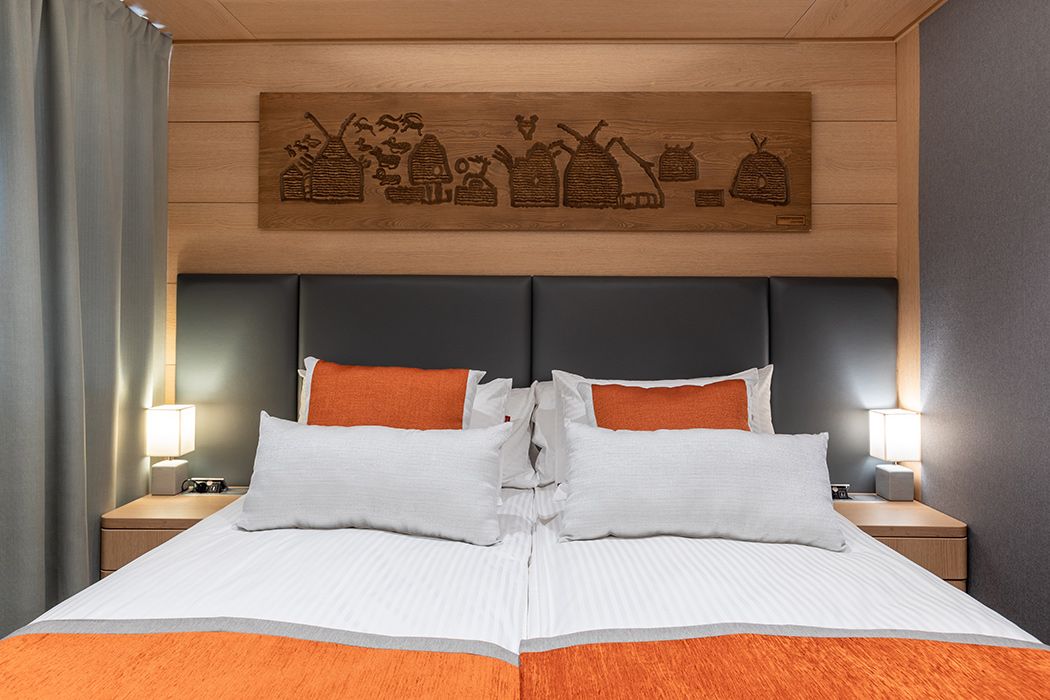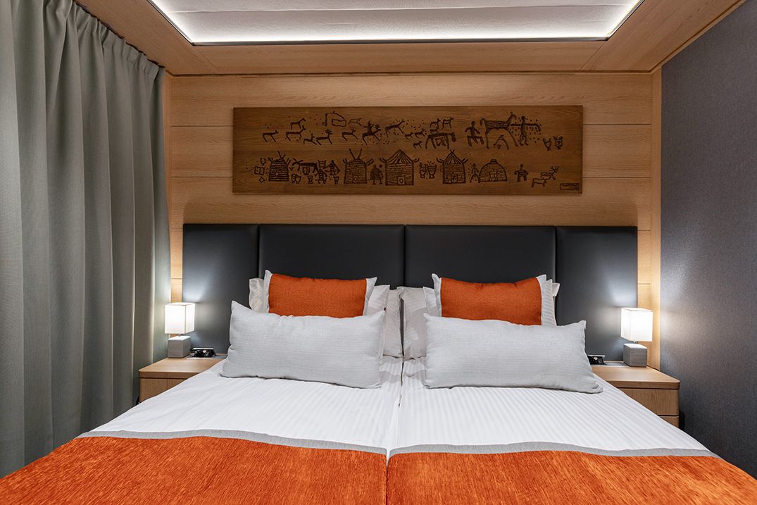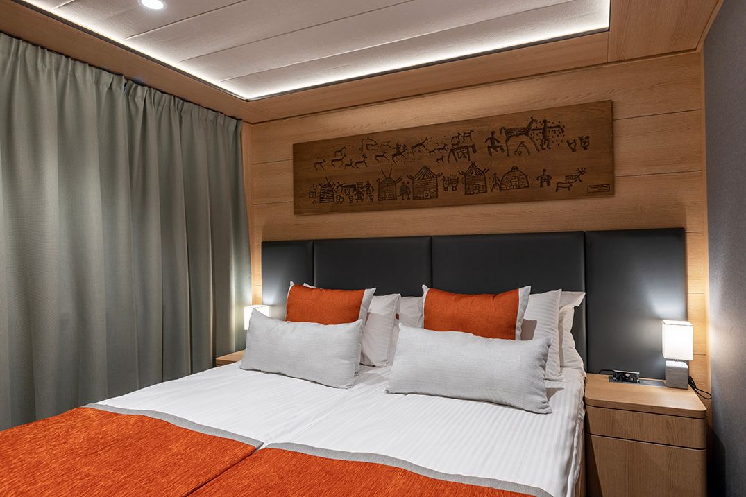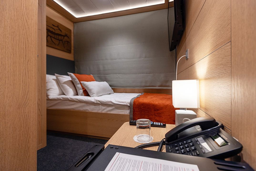 В каюте: две односпальные кровати или двуспальная кровать, шкаф для одежды, холодильник, телевизор, фен, сейф, радио, два окна, электророзетка на 220V: