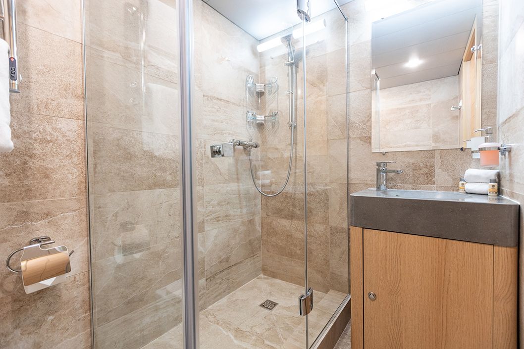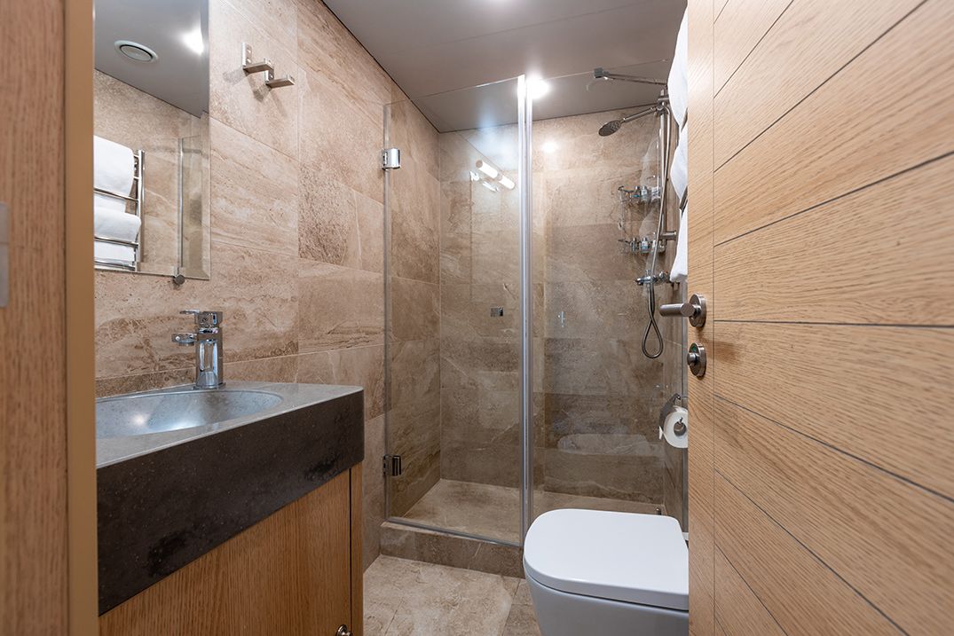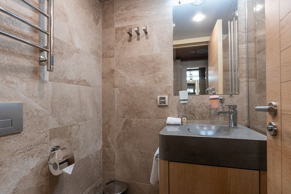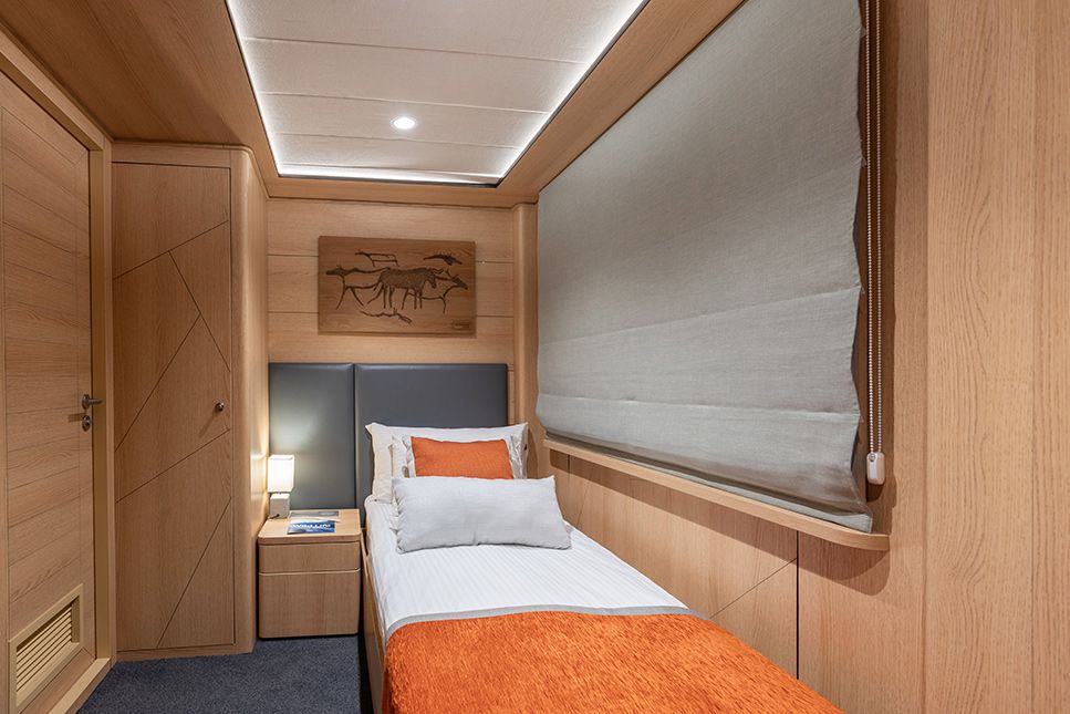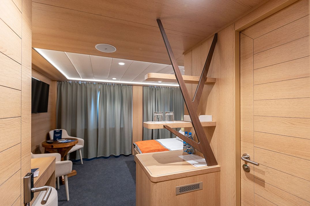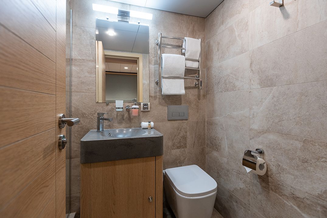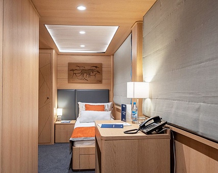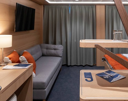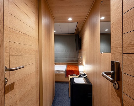Площадь — 17,7 м2. Однокомнатная каюта с удобствами (душ, санузел, кондиционер) рассчитана на размещение до трех человек.