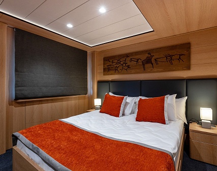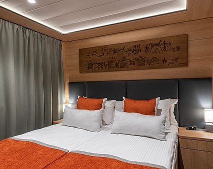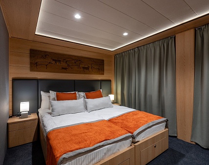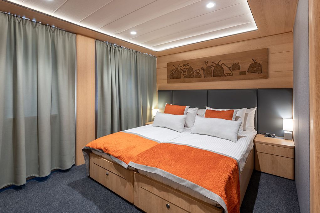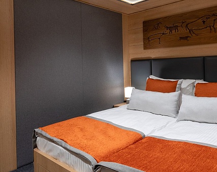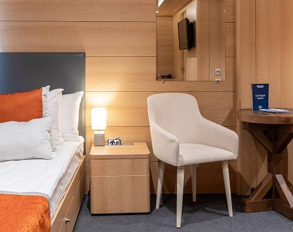 Площадь 12,5 м2. Однокомнатная каюта с удобствами (душ, санузел, кондиционер) рассчитана на размещение до двух человек.