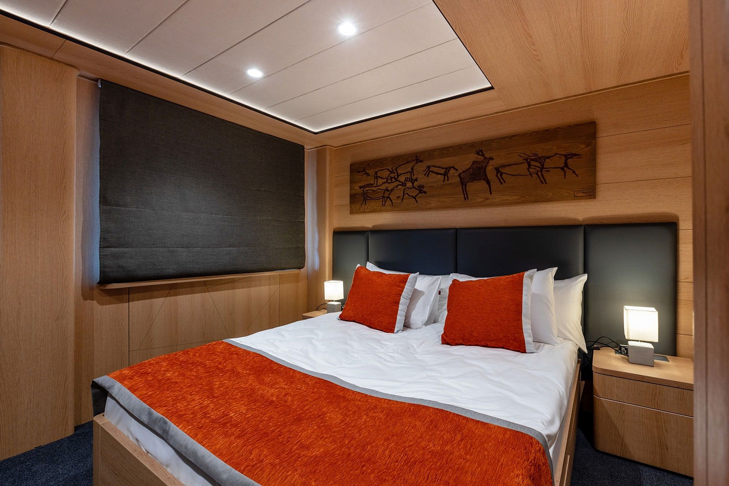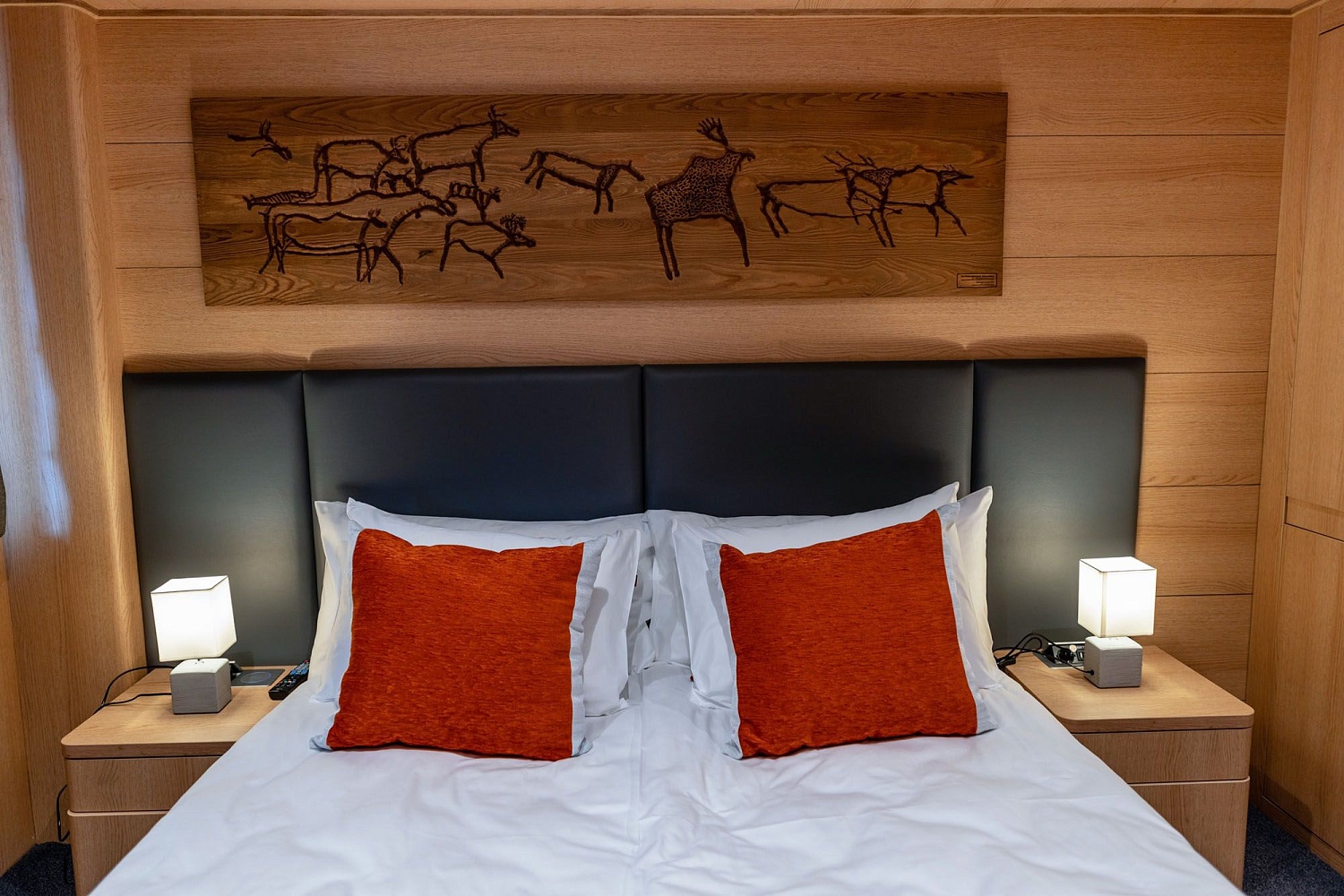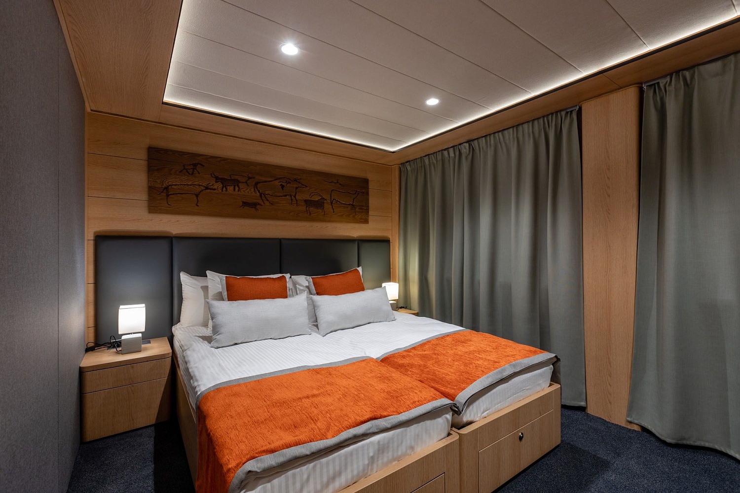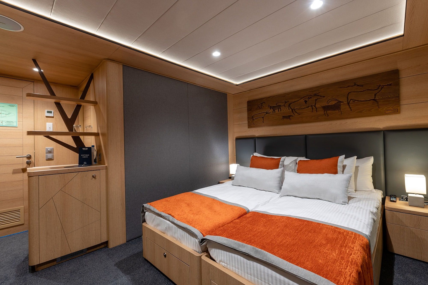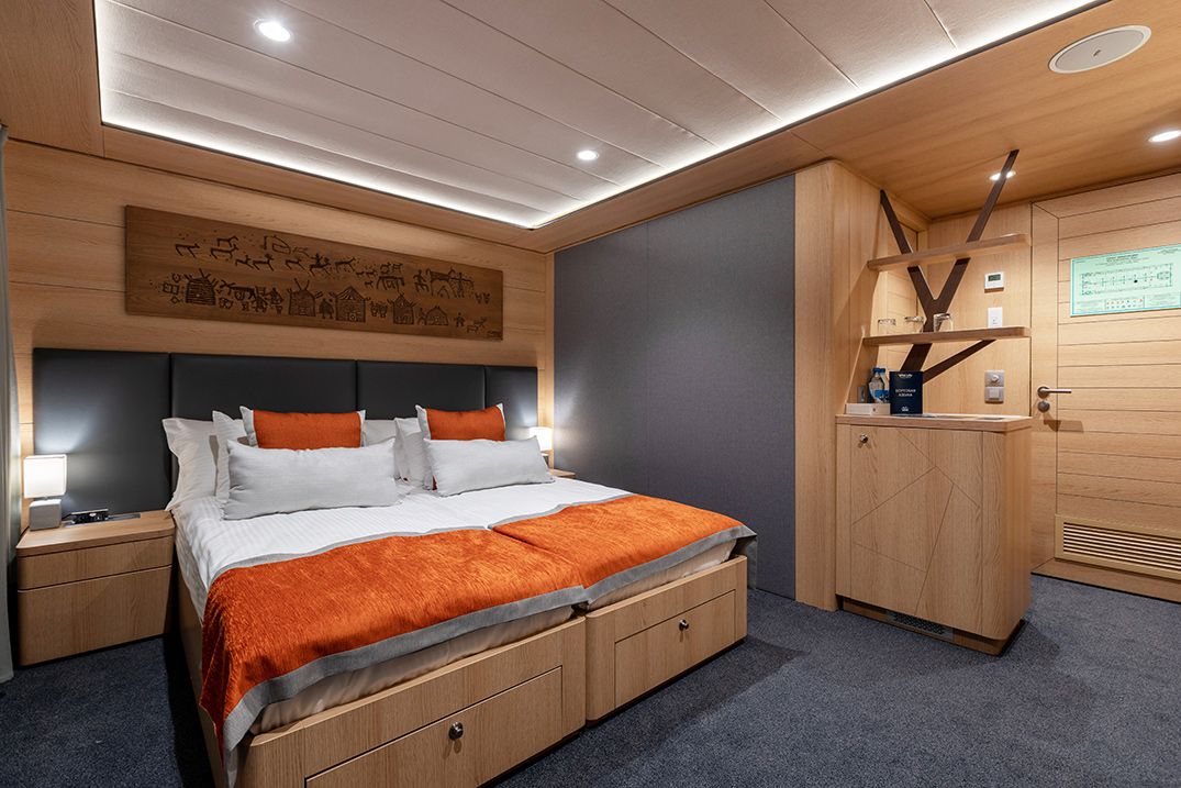 В каюте: двуспальная кровать, шкаф для одежды, холодильник, телевизор, фен, сейф, радио, два окна, электророзетка на 220V