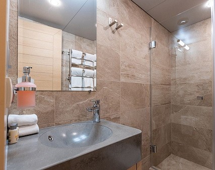 Площадь — 17,7 м2. Однокомнатная каюта с удобствами (душ, санузел, кондиционер) рассчитана на размещение до трех человек.
