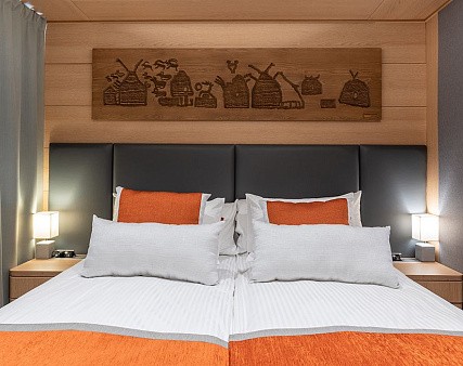 В каюте: две односпальные кровати или двуспальная кровать, шкаф для одежды, холодильник, телевизор, фен, сейф, радио, два окна, электророзетка на 220V: