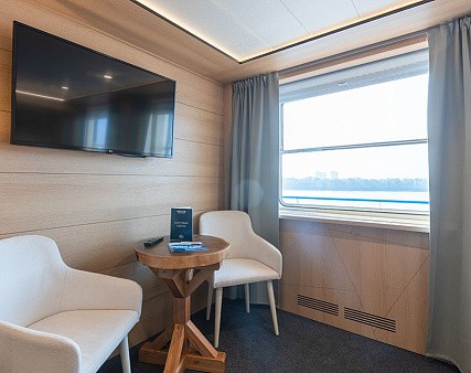 В каюте: односпальная кровать, шкаф для одежды, радио, кондиционер, телевизор, холодильник, фен, сейф, душ, санузел, обзорное окно, электророзетка на 220V.