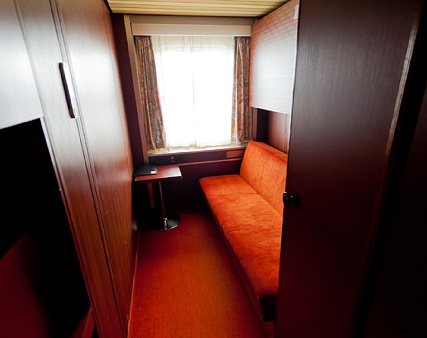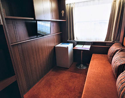 В каюте: односпальный раскладной диван, душ, туалет, радиоточка, кондиционер, шкафы, прикроватный стол, стул.