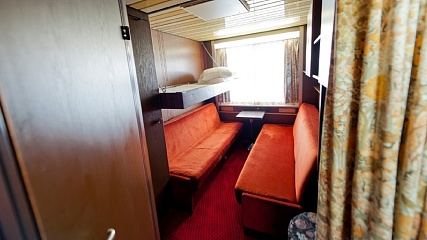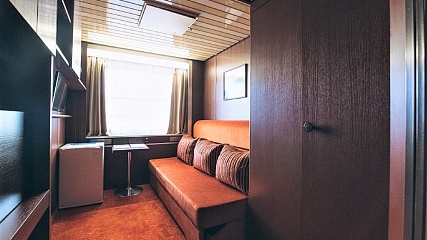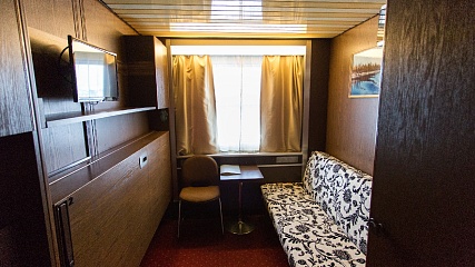 В каюте: односпальный раскладной диван, душ, туалет, радиоточка, кондиционер, шкафы, прикроватный стол, стул.