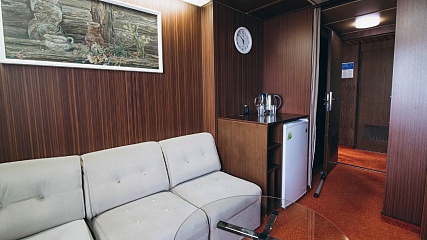 В каюте: диван двуспальный, душ, туалет, радиоточка, мини-холодильник, ТV, дополнительный индивидуальный кондиционер, шкаф, прикроватный столик, стул.