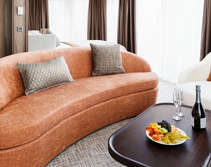 В каюте: терраса, двуспальная кровать, прикроватные тумбы, диван и два кресла, журнальный стол, туалетный столик, стул, шкаф, телевизор, холодильник, капсульная кофемашина (1 капсула в день на человека (по количеству гостей в каюте), чайник, радио, телефон, санузел с душем, кондиционер, фен, сейф, электророзетка на 220V.