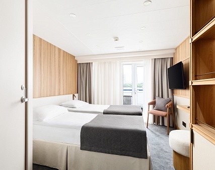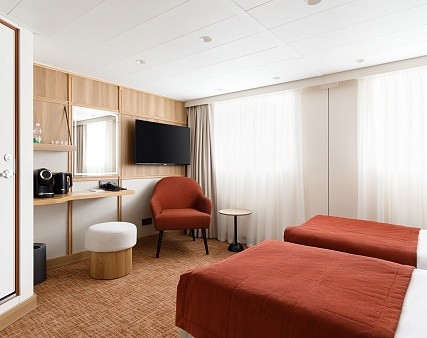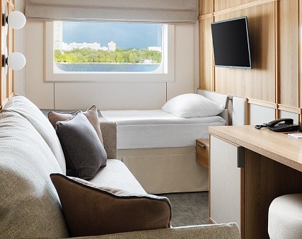 В каюте: две односпальные кровати (можно сдвинуть), прикроватные тумбы, туалетный столик, стул, шкаф, телевизор, холодильник, капсульная кофемашина (1 капсула в день на человека (по количеству гостей в каюте), чайник, радио, телефон, обзорное окно, душ, санузел, кондиционер, фен, сейф, халаты, электророзетка на 220V.