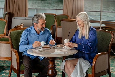 - Обед – заказная система питания (выбор блюд со 2-го дня круиза), фиксированная рассадка. Включённые напитки (без ограничения): вода, чай, кофе, морс.