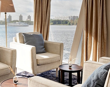 В каюте: двуспальная кровать (раздвигается), диван, панорамные окна, спутниковое ТВ, шкаф для одежды, холодильник, кондиционер, розетки 220V, телефон, радио, фен, капсульная кофемашина, электрочайник, сейф, ванна или душ, санузел. Площадь — до 37 м2.