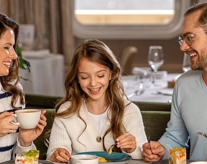 - Обед — заказная система питания (выбор блюд со 2-го дня круиза) с элементами шведского стола (десерт, фрукты, морсы), фиксированная рассадка. Включённые напитки (без ограничения): вода, чай, кофе, домашний морс;
